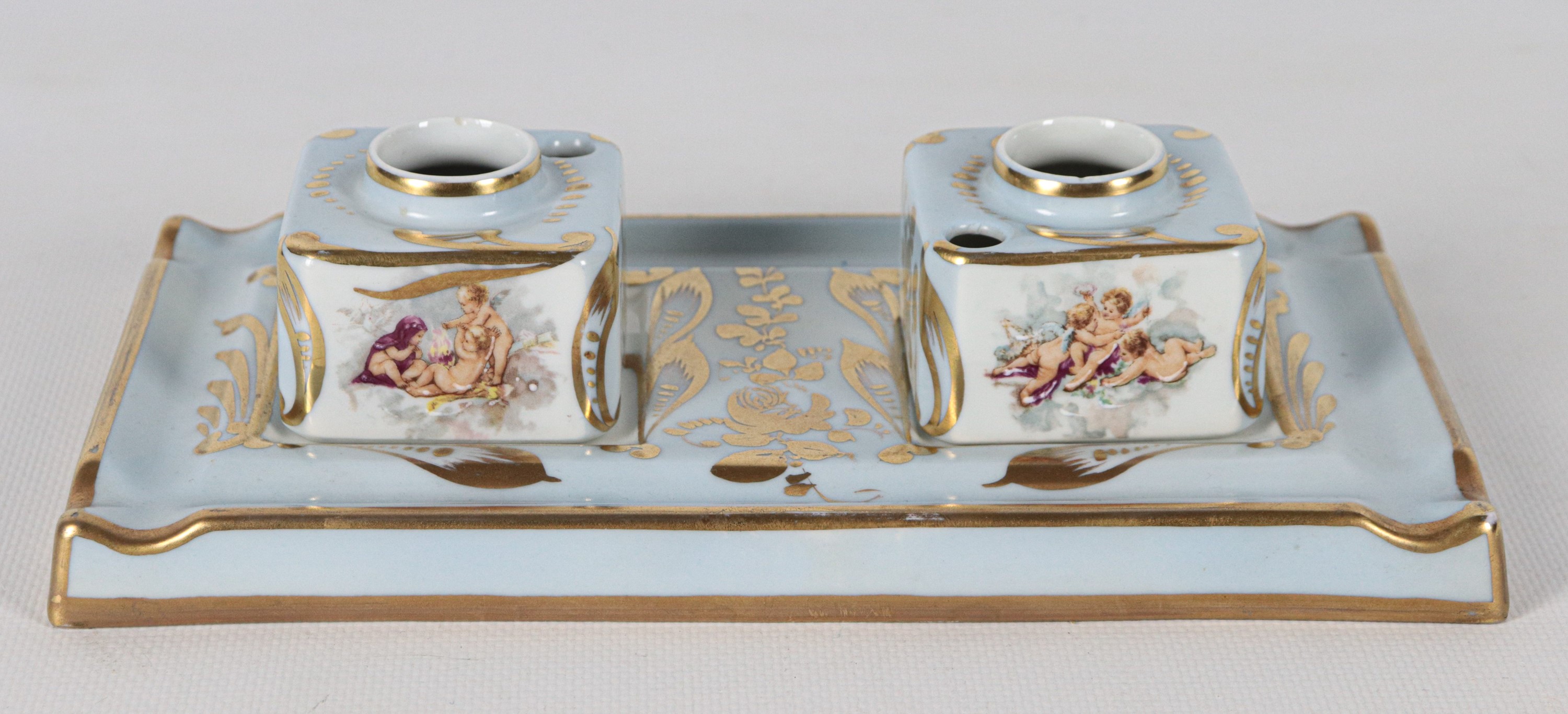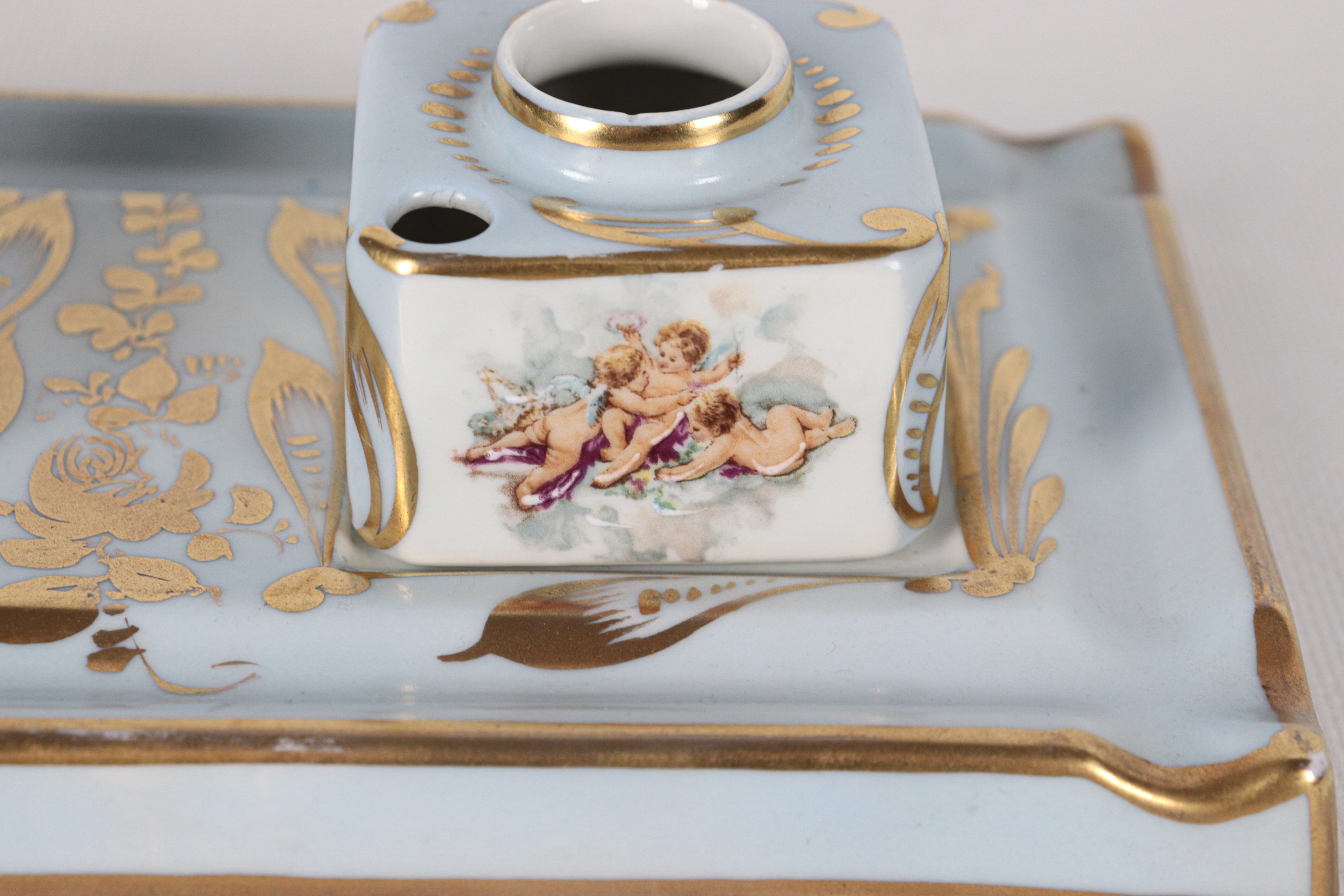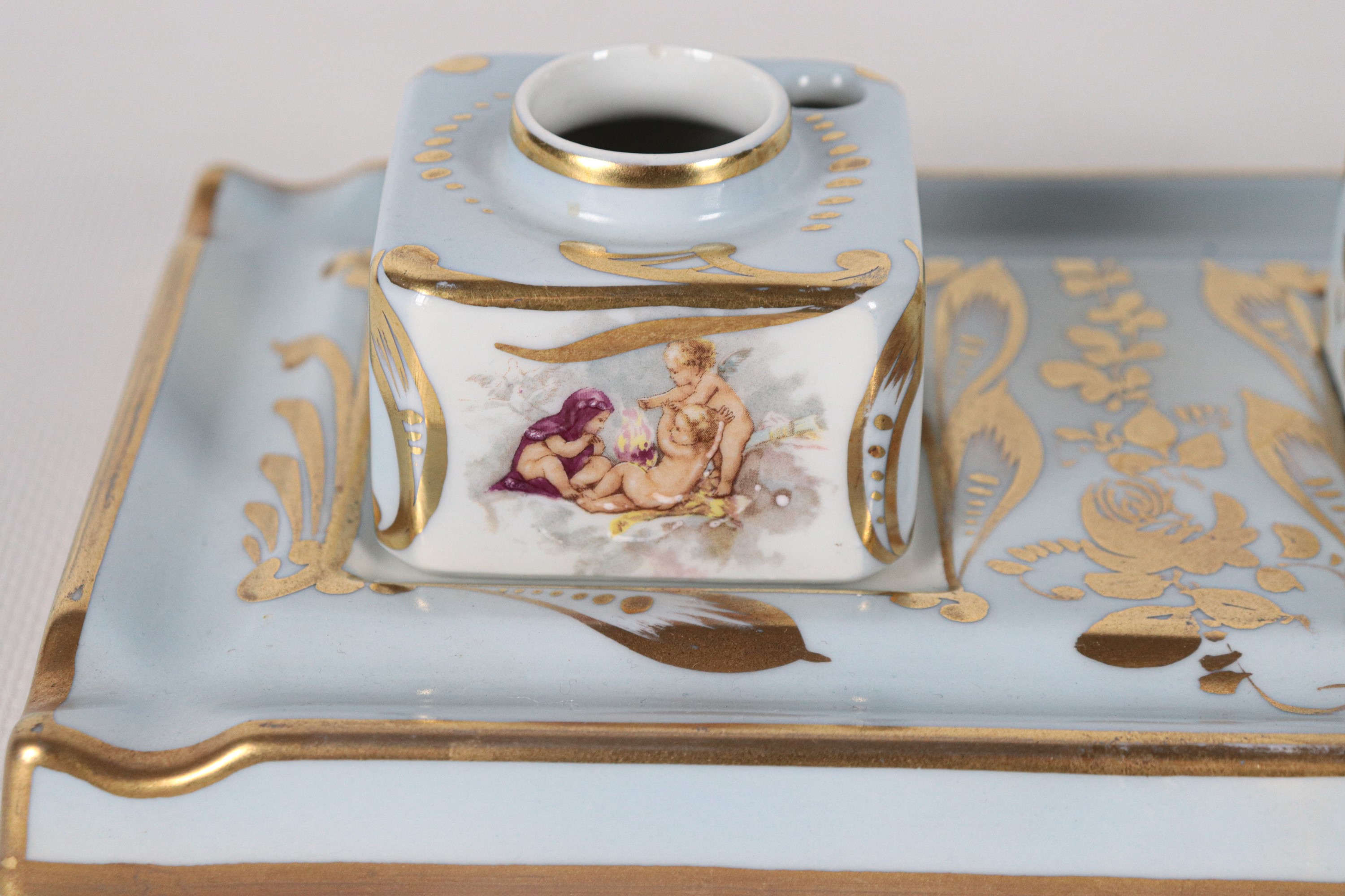 French Limoges porcelain inkwell in light blue, with decorations of cherubs and pure gold