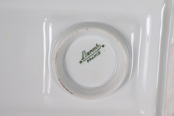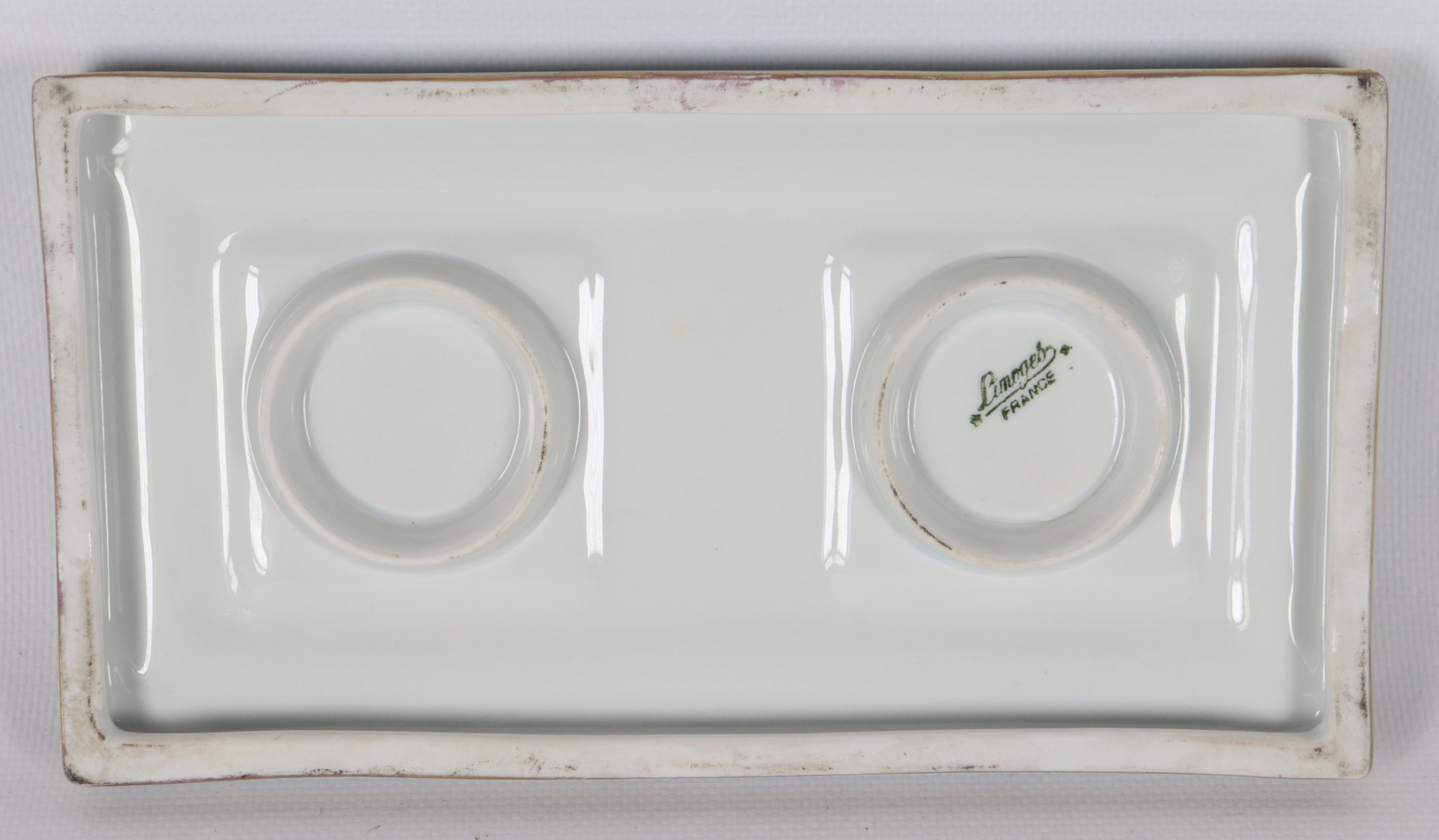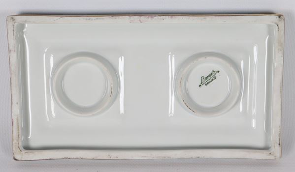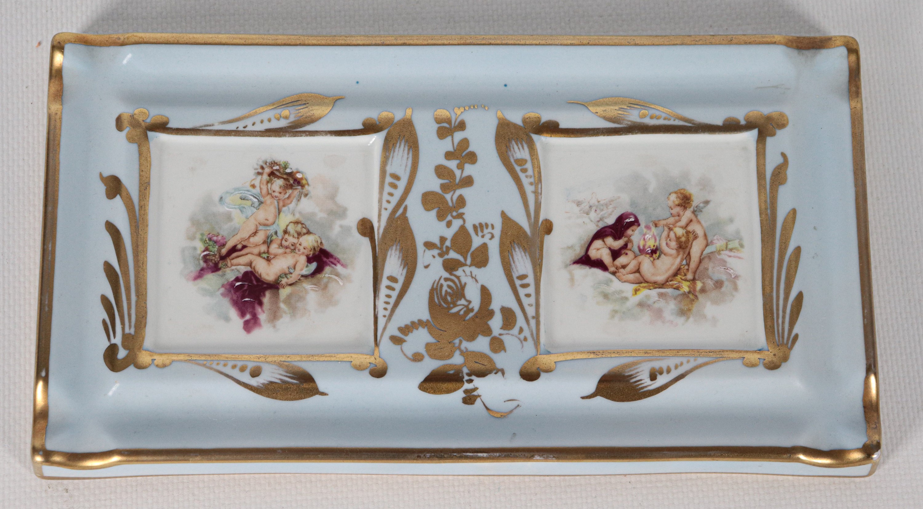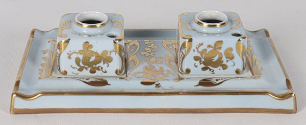 French Limoges porcelain inkwell in light blue, with decorations of cherubs and pure gold