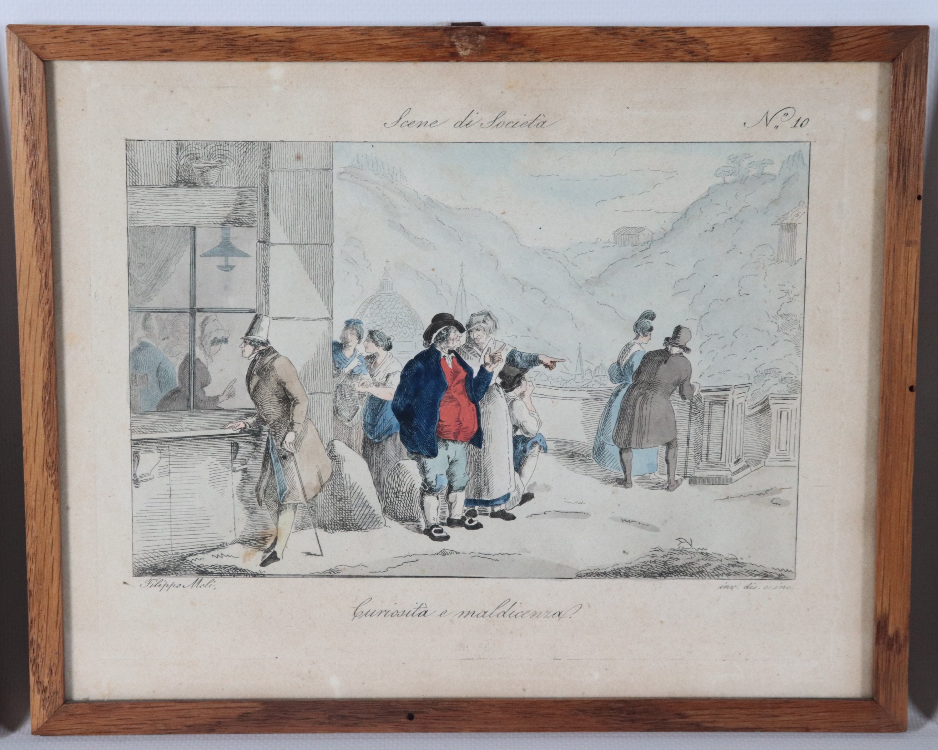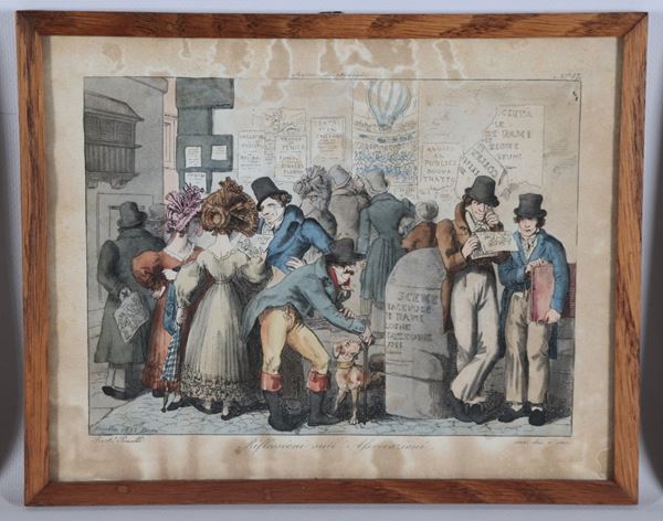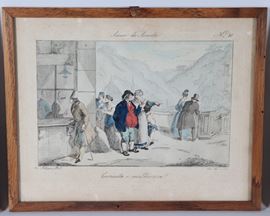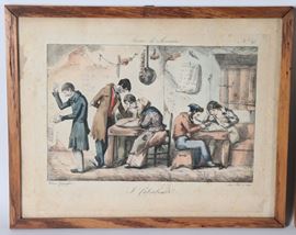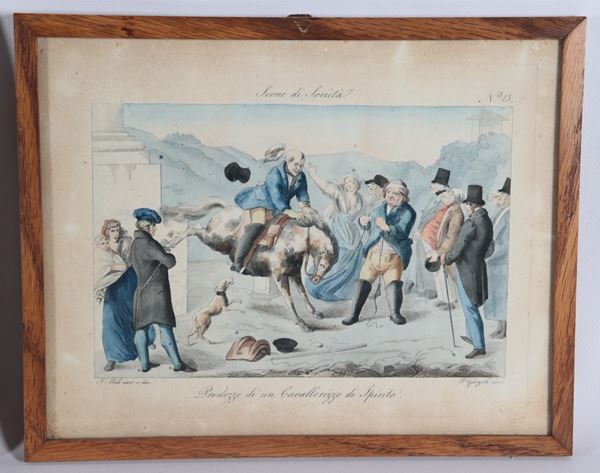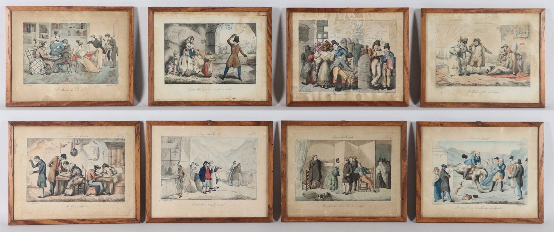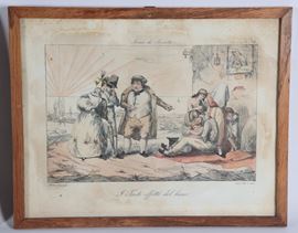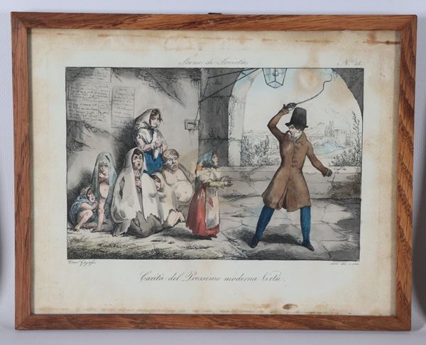 Lot of eight small antique watercolor engravings "Grotesque Scenes"