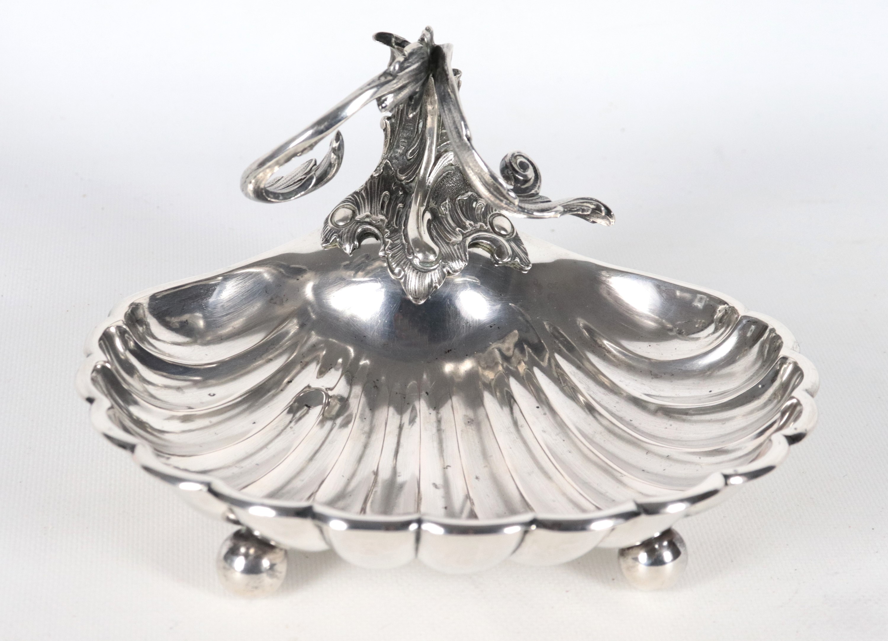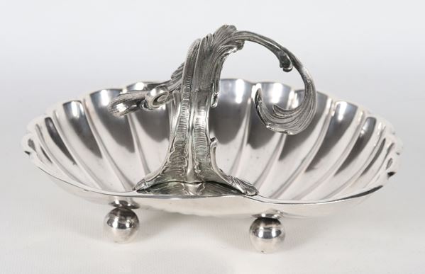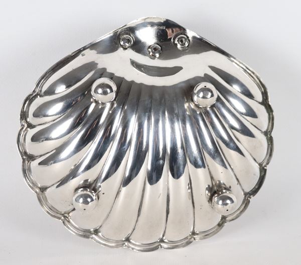 Large shell in chiseled and embossed silver, supported by four spherical feet, 480 g