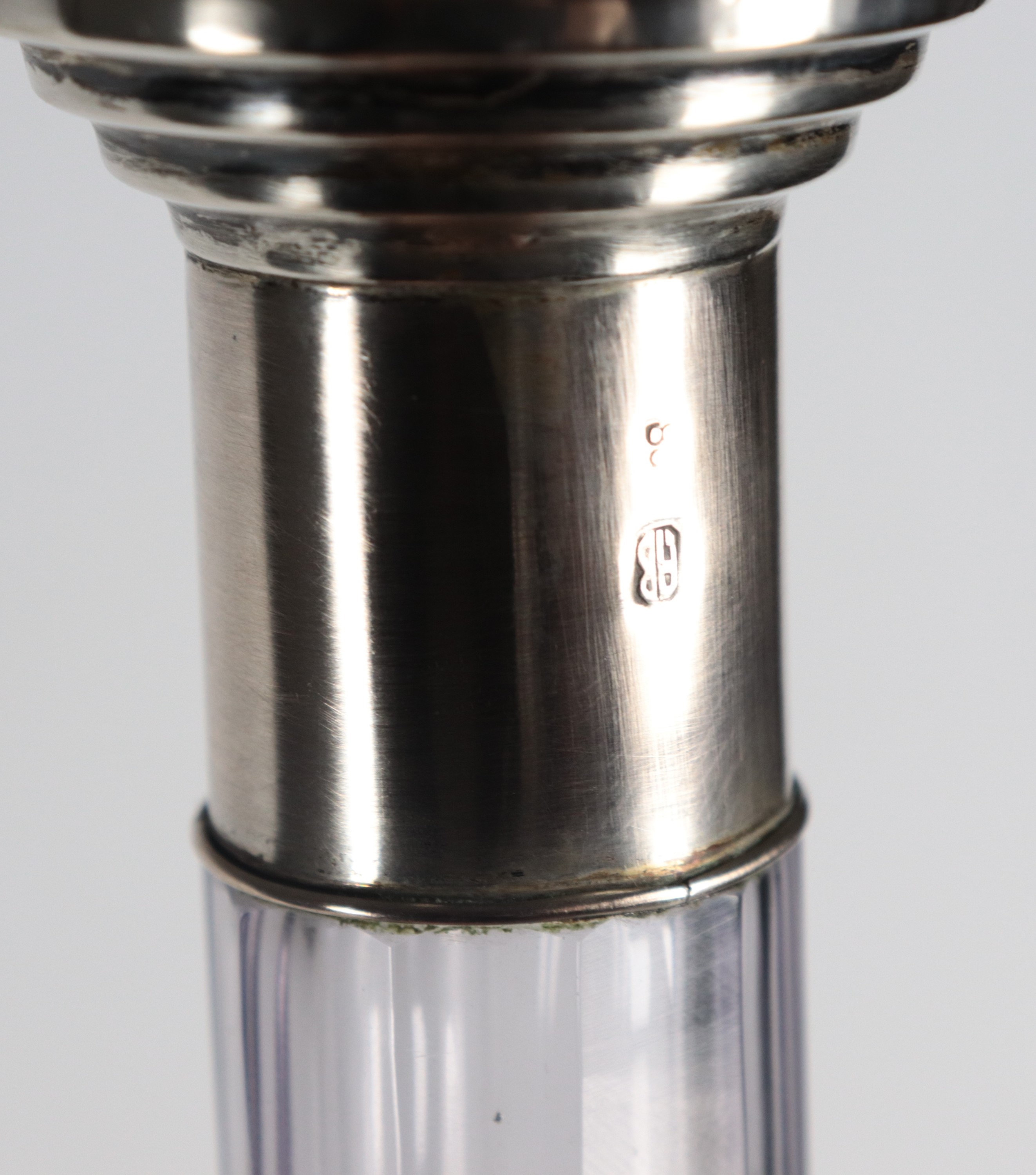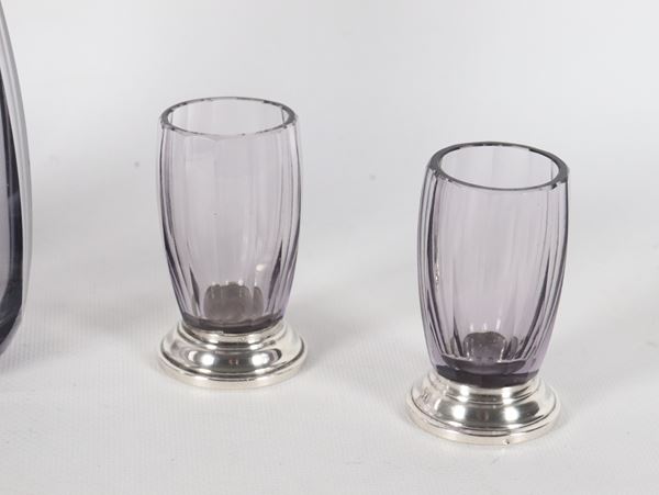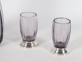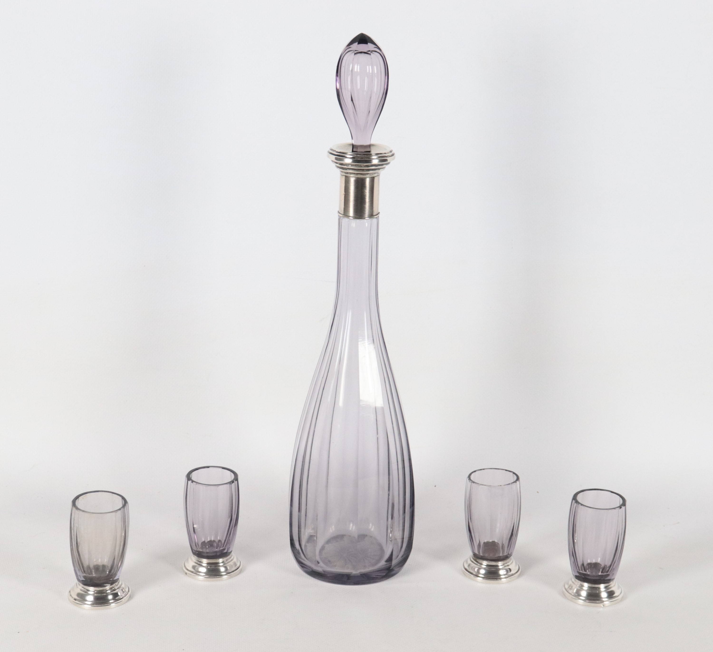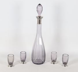 Liberty liquor set in smoked glass with silver garnish, bottle and four glasses