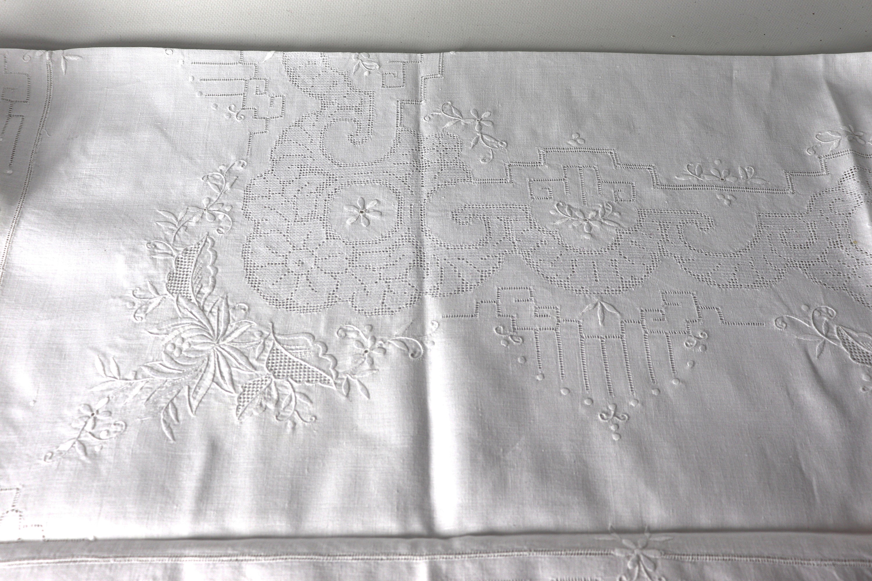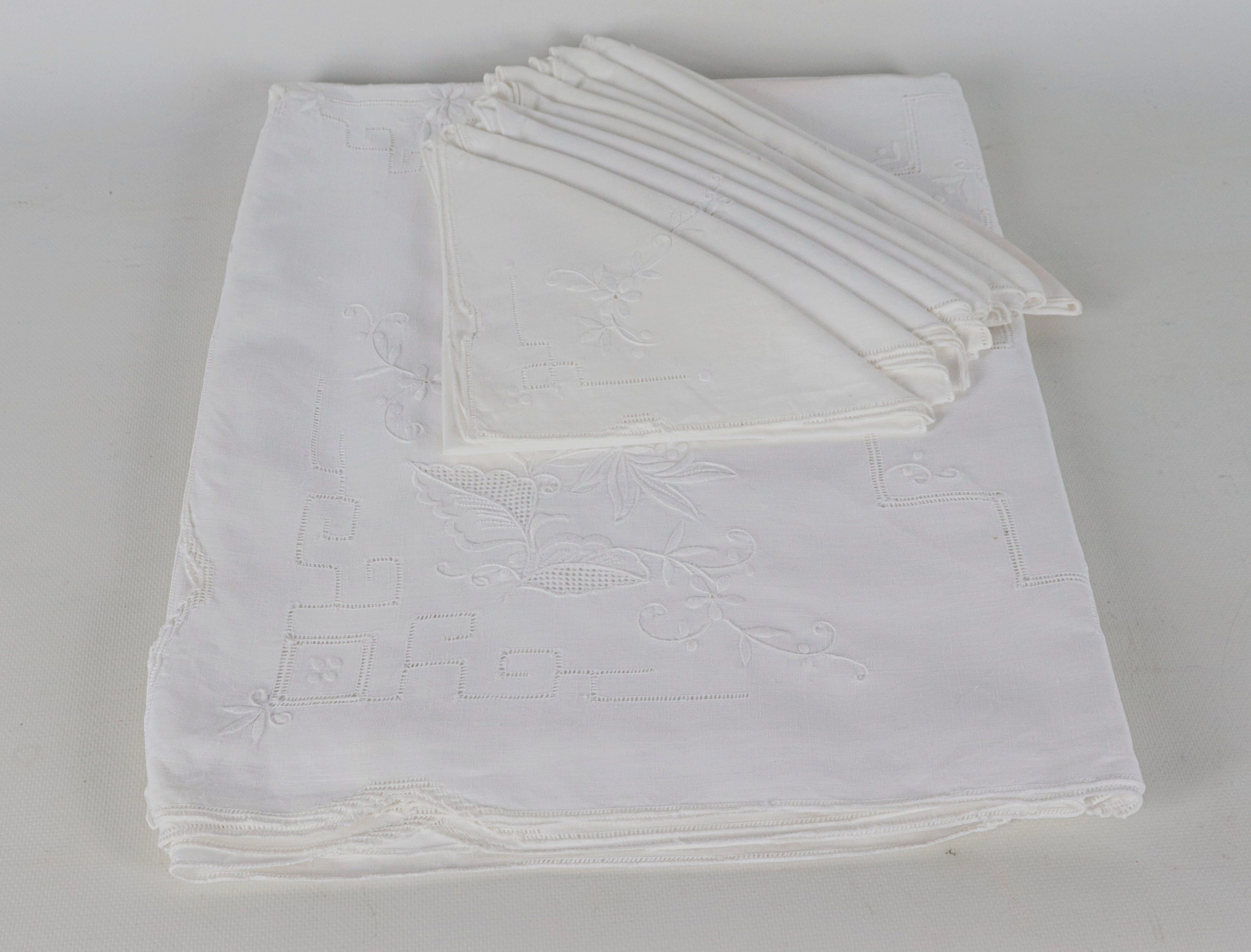 Linen tablecloth with ten napkins, embroidered with floral motifs