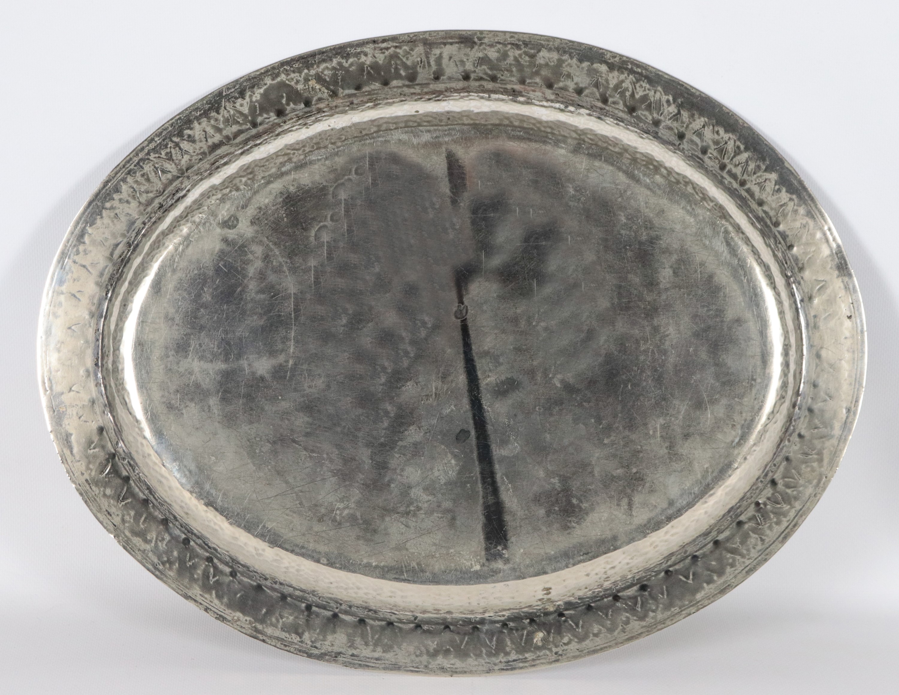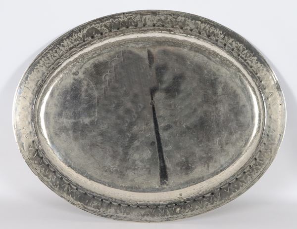 Oval serving tray in silver-plated metal, with embossed and chiseled edge with palmette motifs