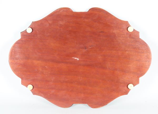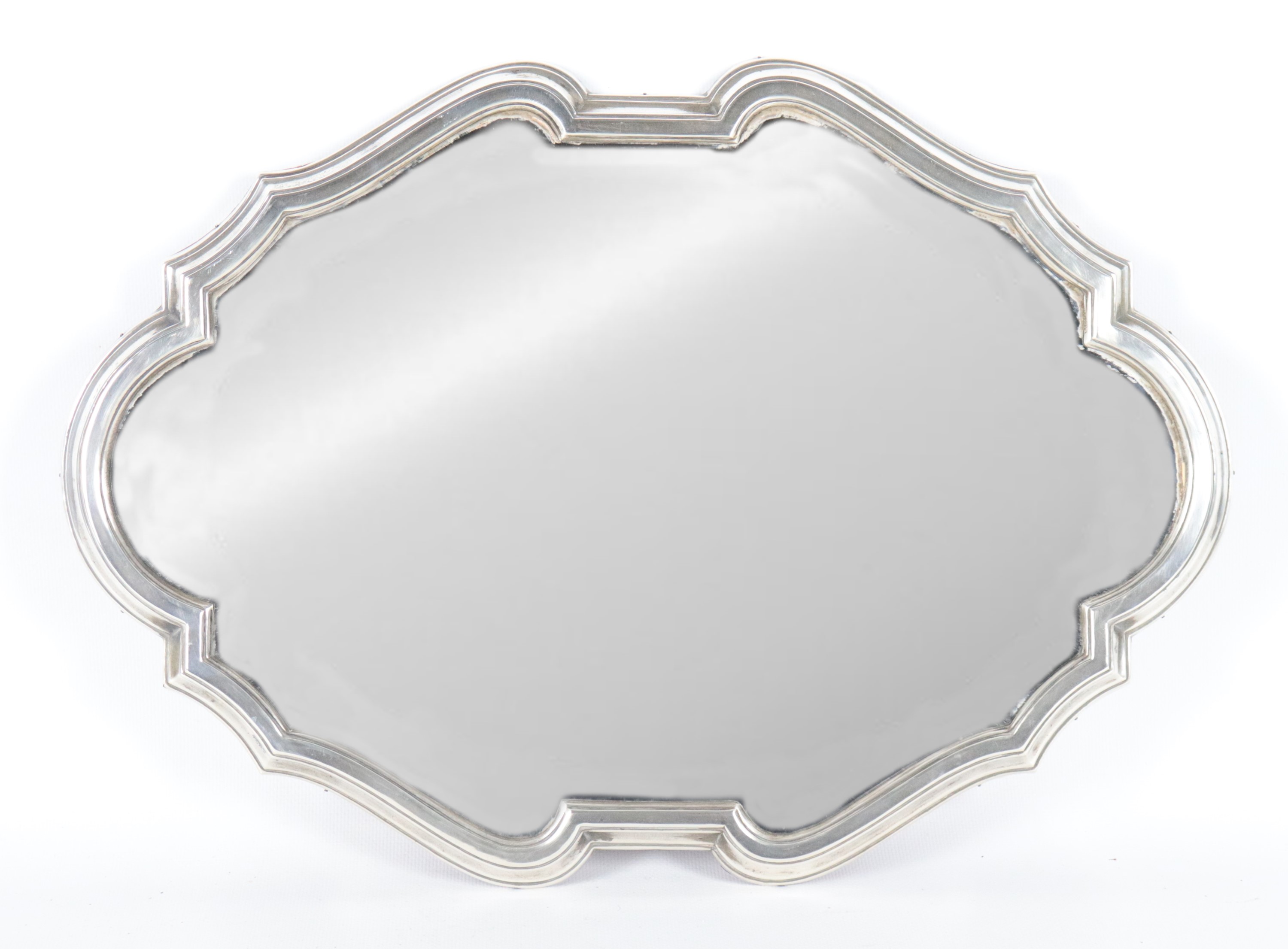 Oval wooden centerpiece with shaped edge in chiseled and embossed silver, mirrored bottom
