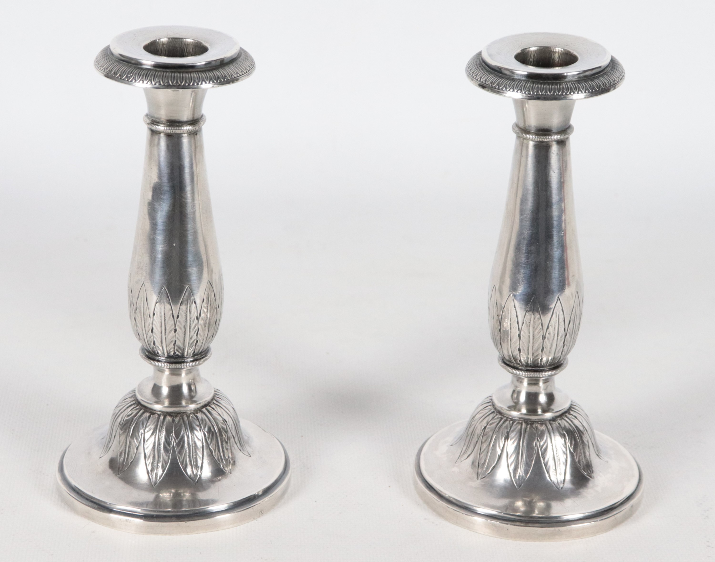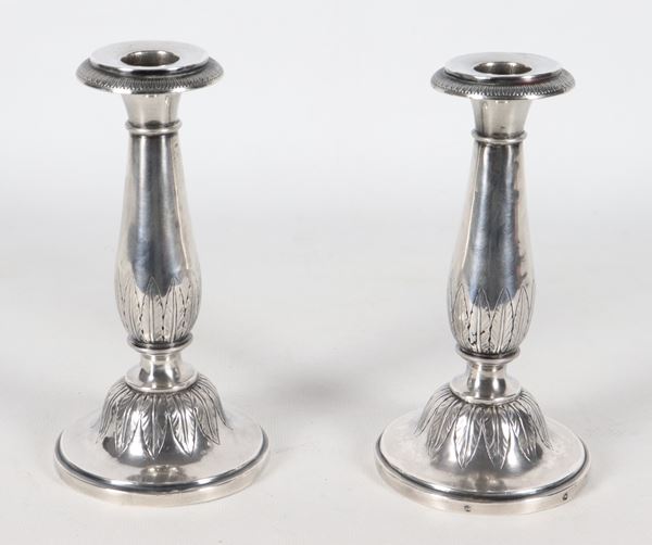 Pair of ancient Roman candlesticks in chiseled and embossed silver, 415 gr.