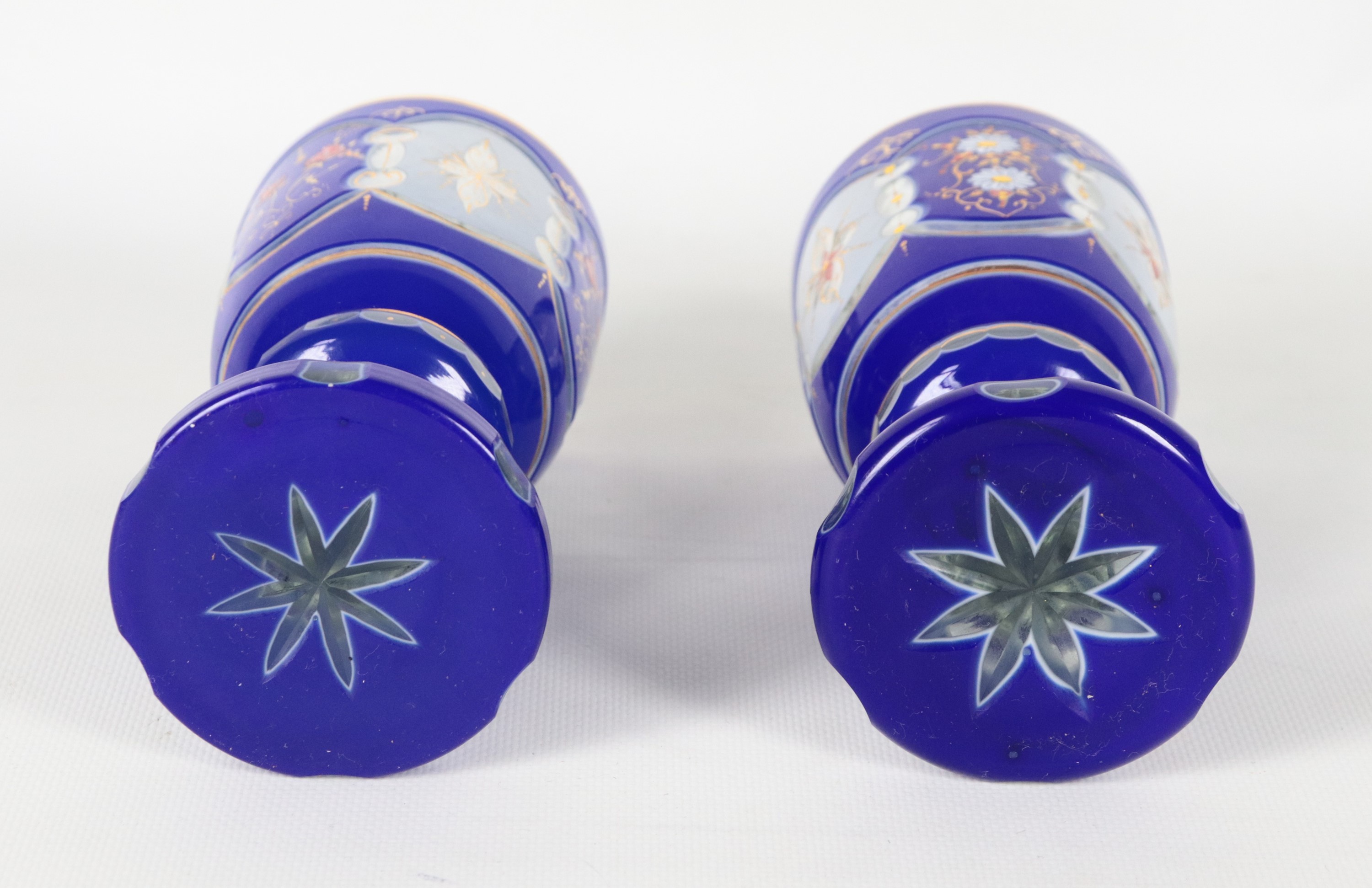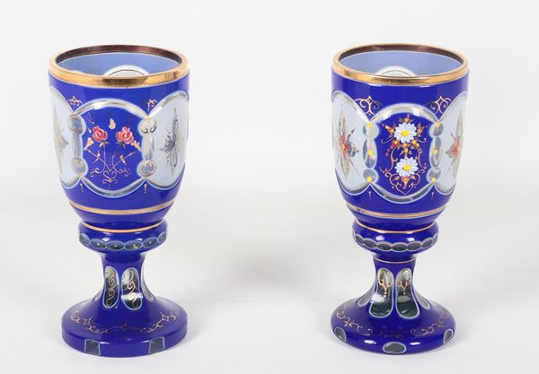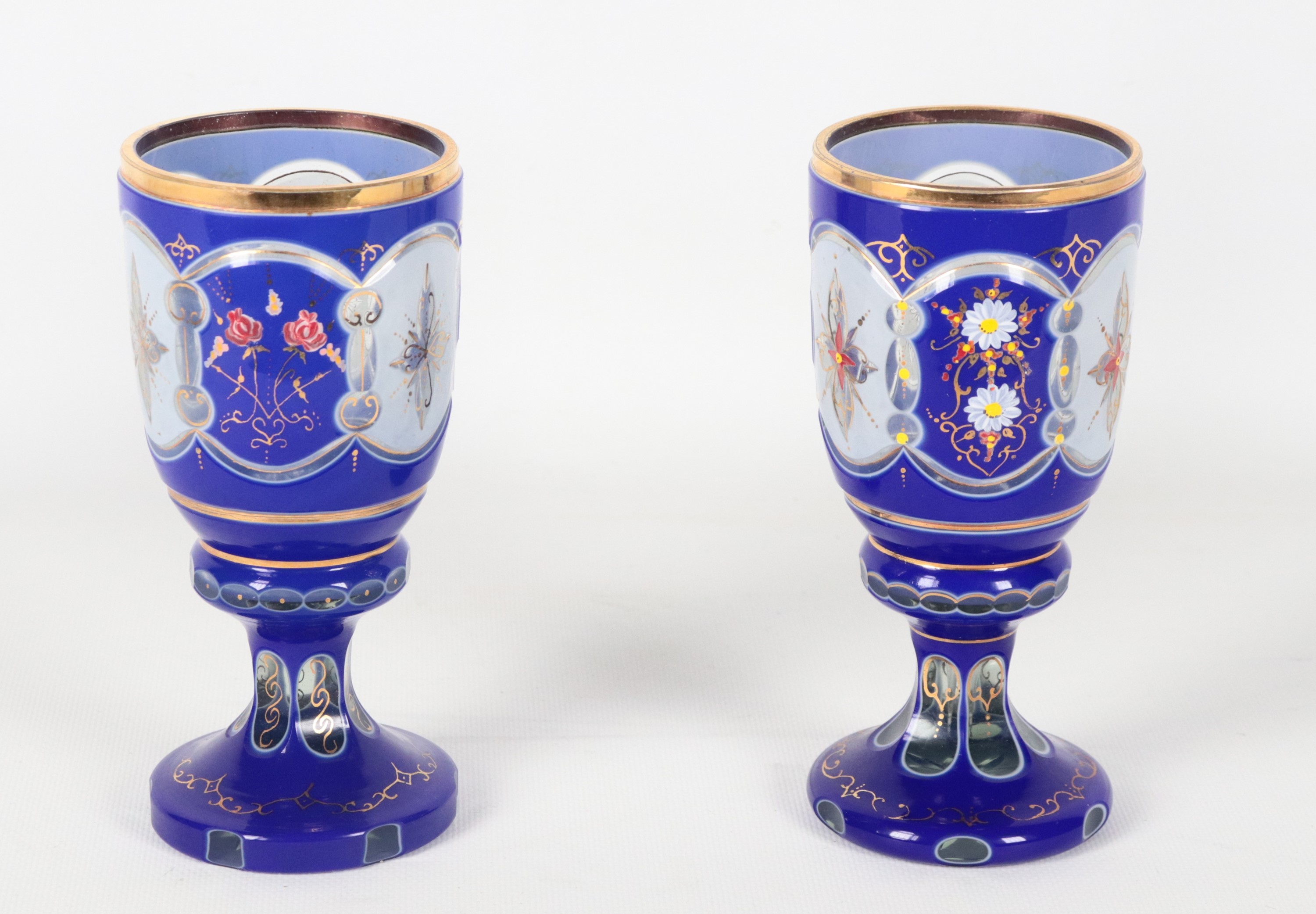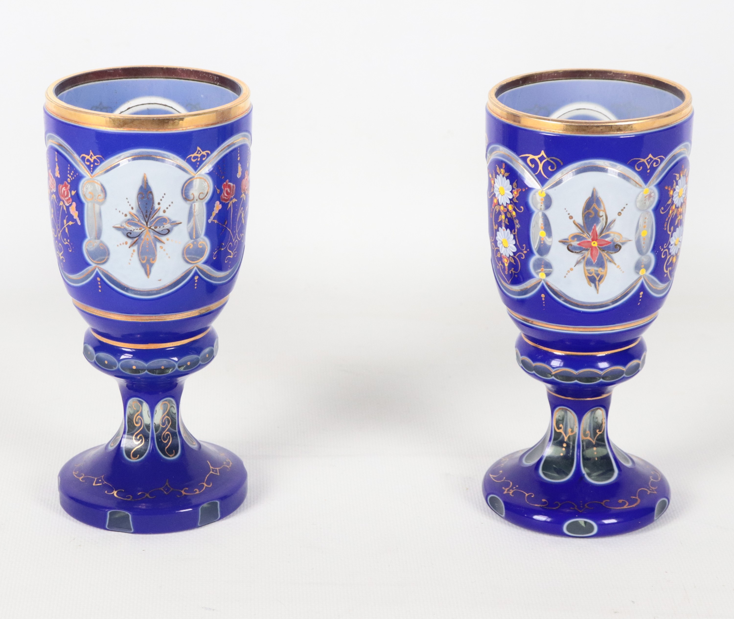 Pair of antique Austrian blue crystal spa glasses with enamel floral decorations