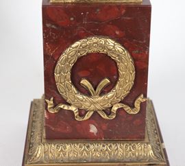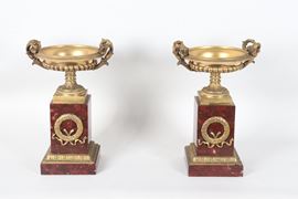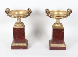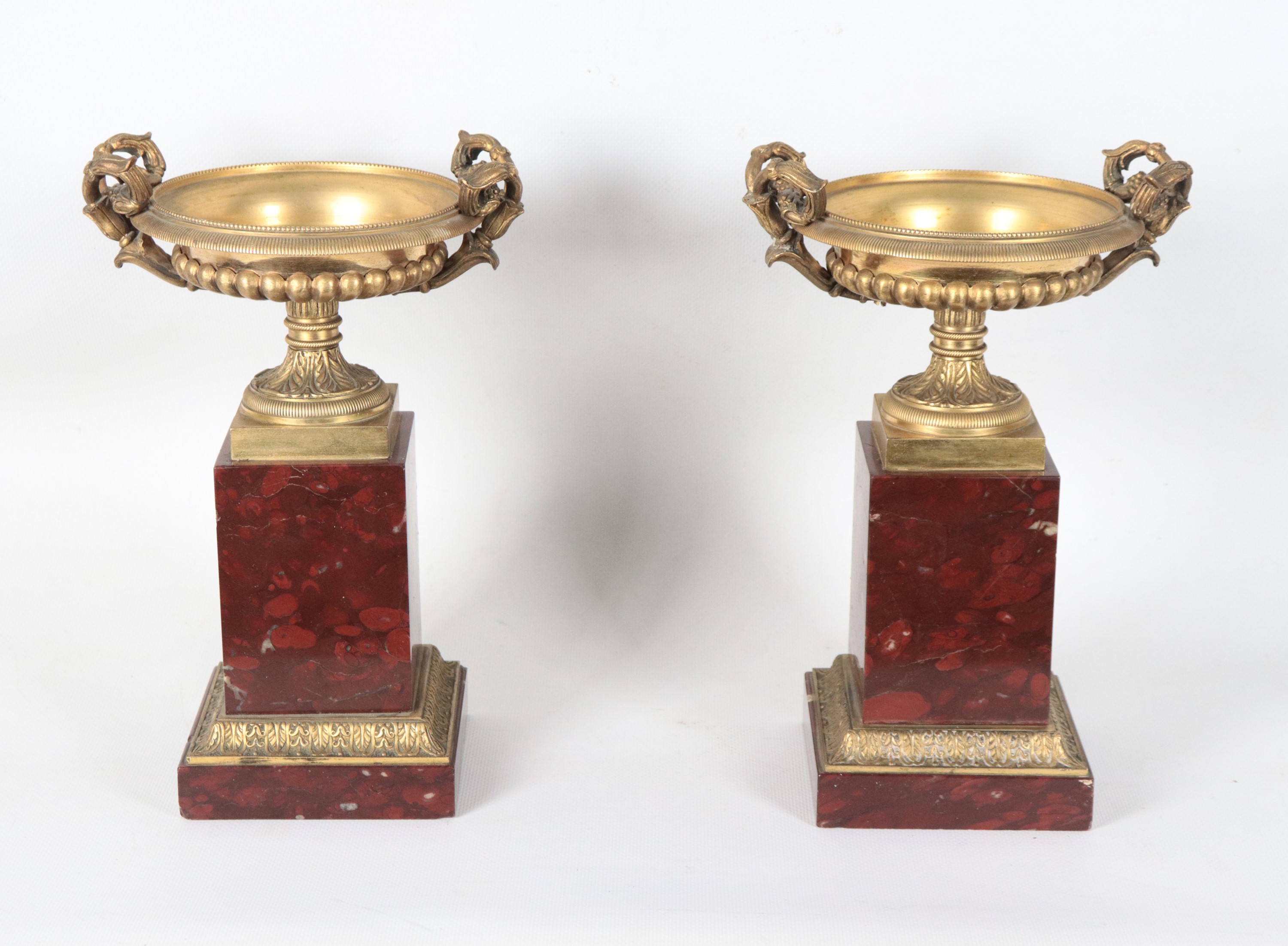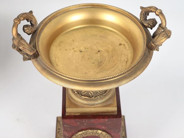 Pair of antique French Empire cups in gilded bronze, embossed and chiseled, supported by quadrangular column bases in red French marble