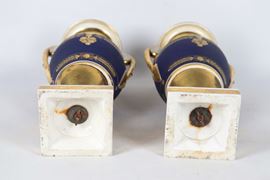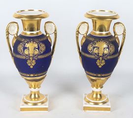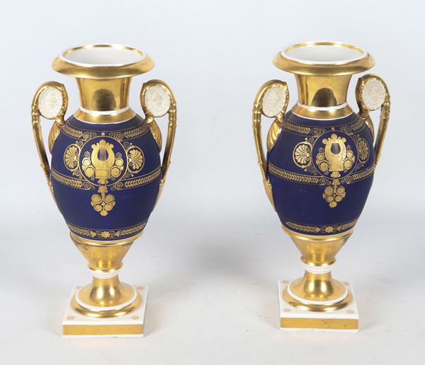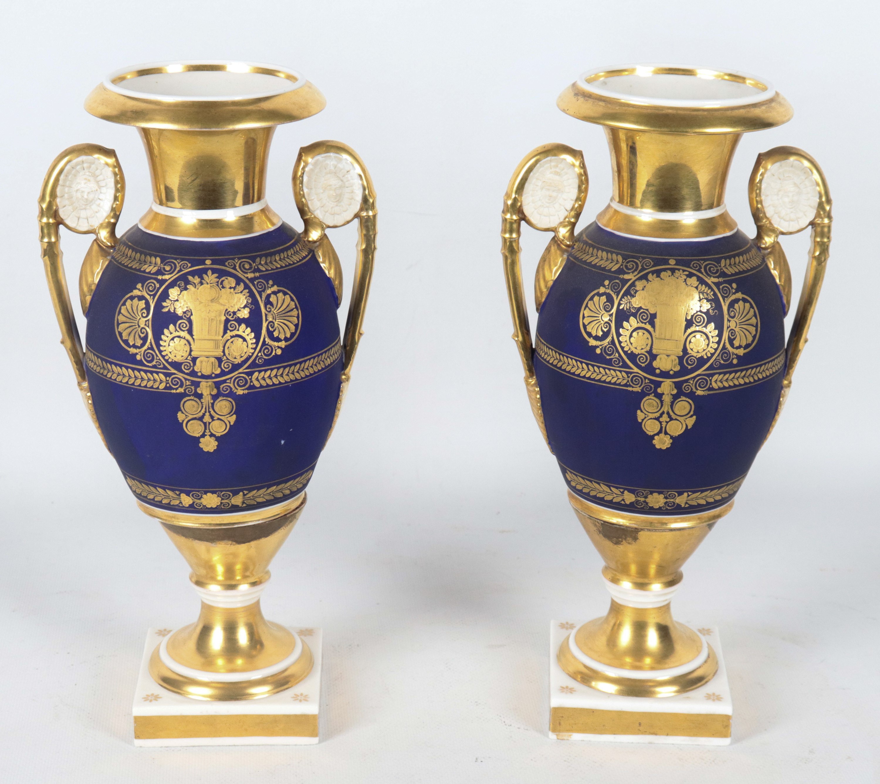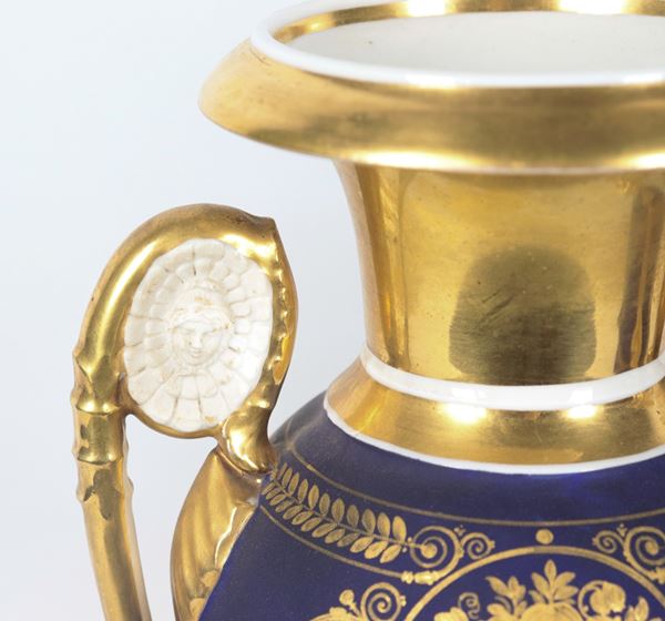 Pair of antique French Retour d'Egypte amphora vases, in cobalt blue porcelain with pure gold decorations in neoclassical motifs