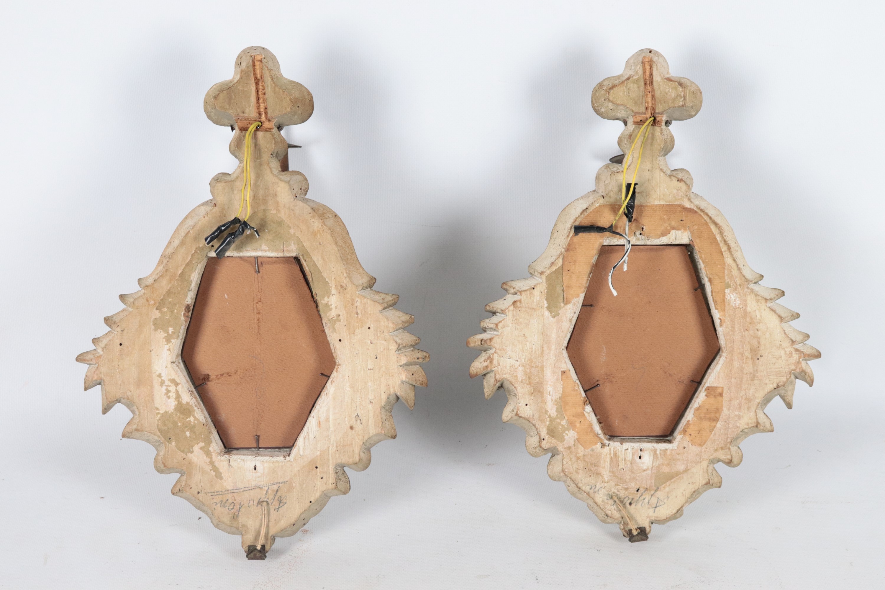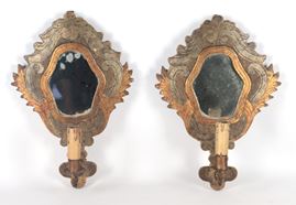 Pair of antique mirrors in gilded and silvered wood, carved with Louis XIV motifs, mercury mirrors and one light each