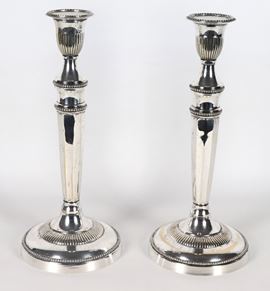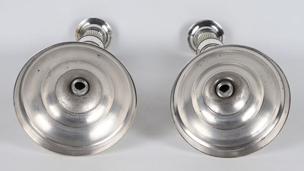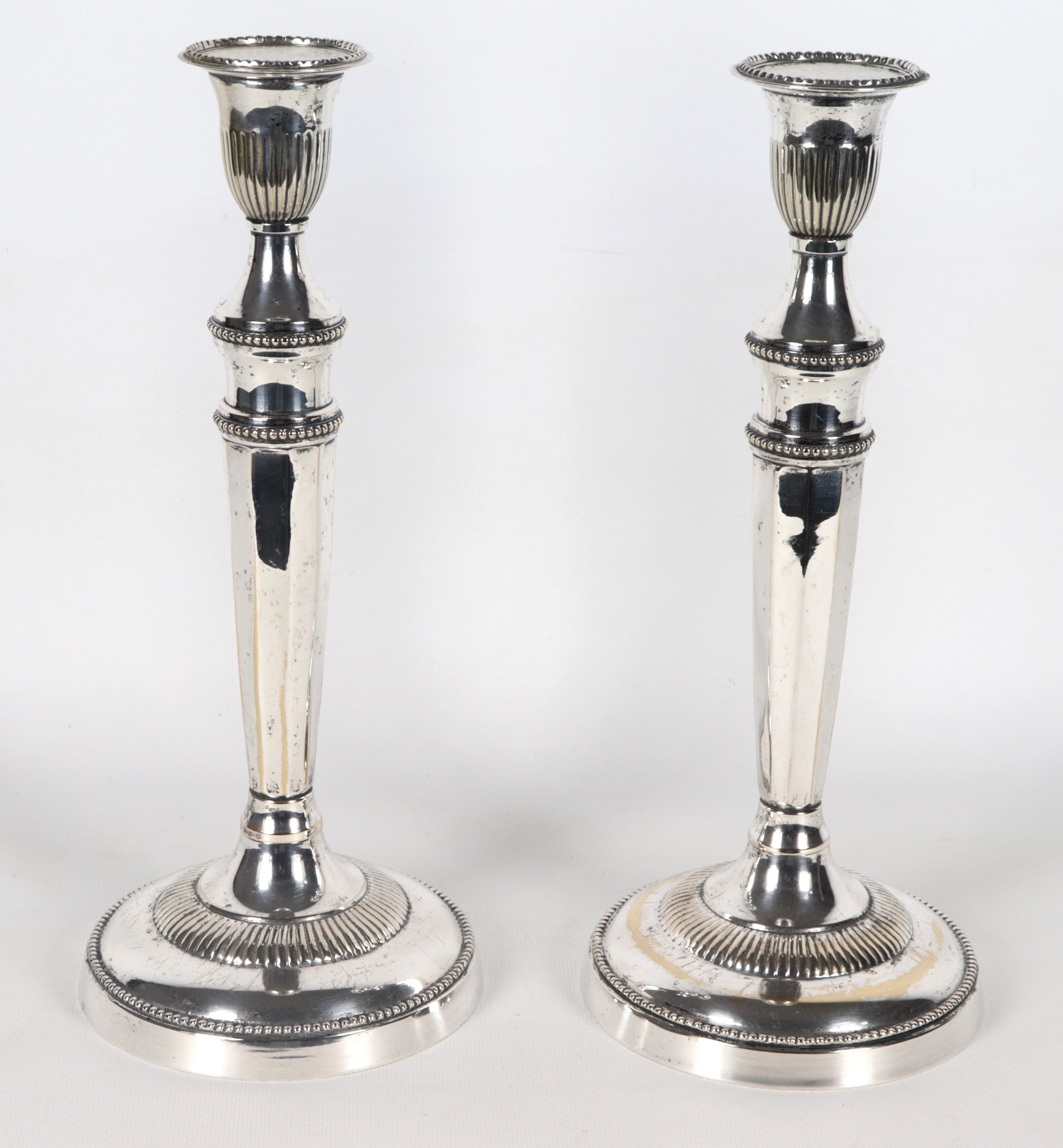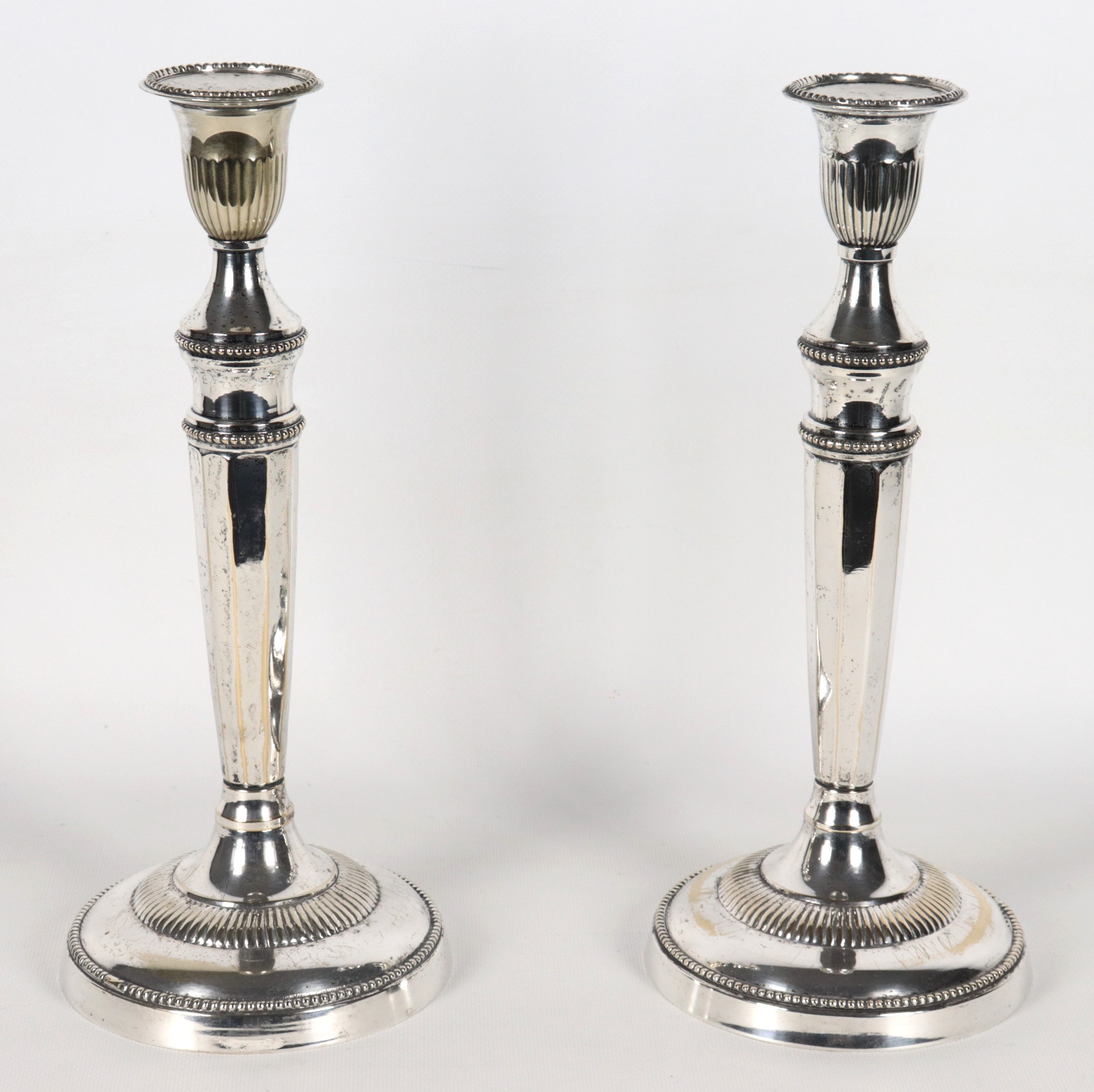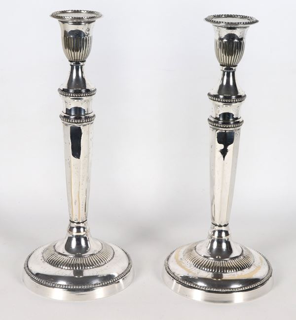 Pair of antique silver-plated candlesticks, chiseled and embossed with Louis XVI motifs