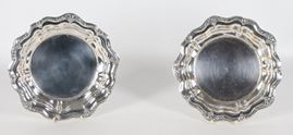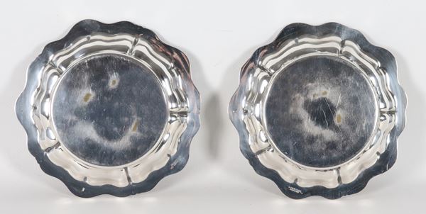 Pair of coasters in silver-plated metal, embossed and chiseled with scroll and grape motifs