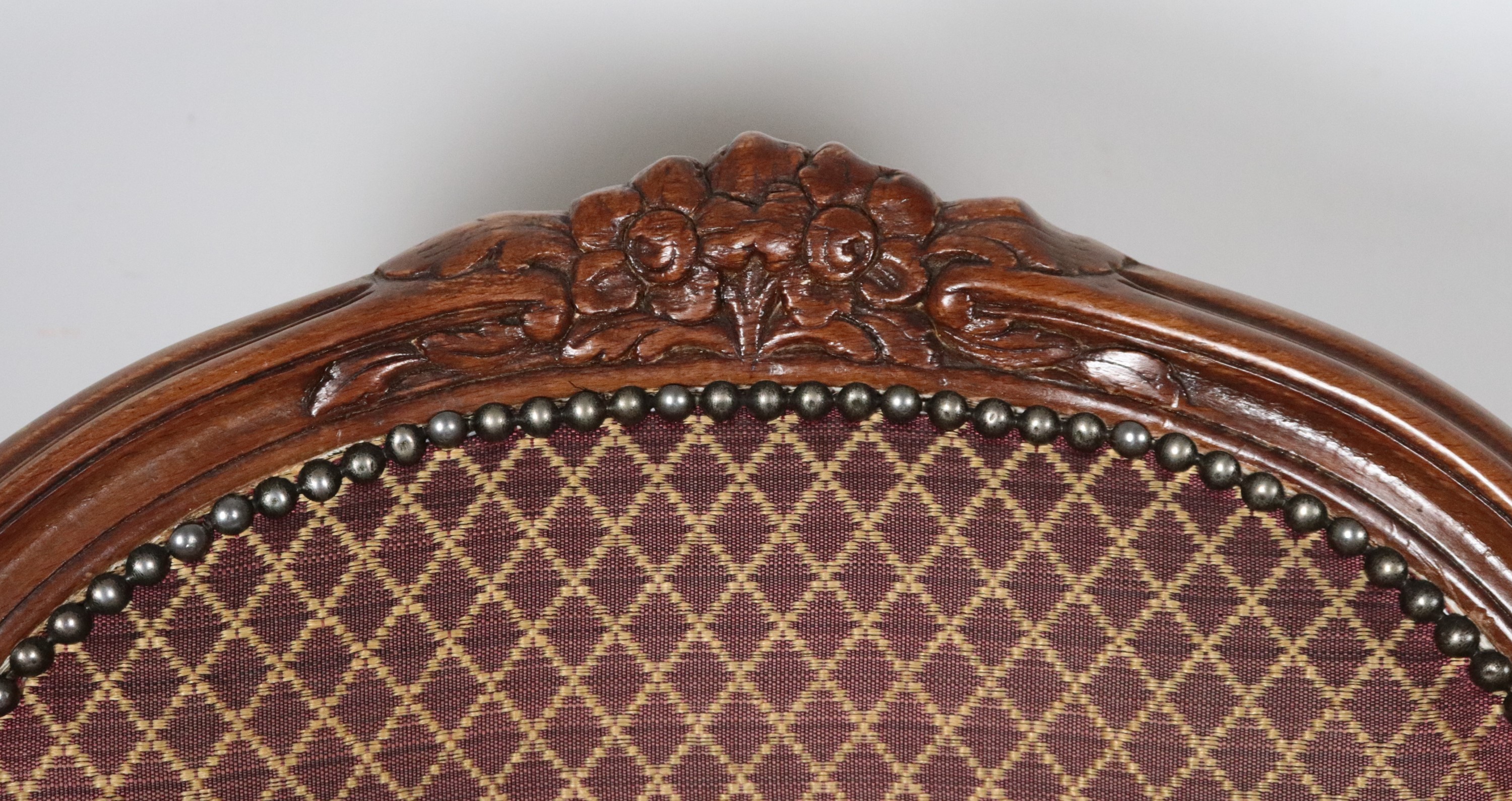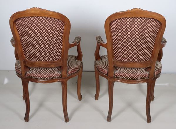Pair of Louis XV walnut armchairs, covered in burgundy fabric with a geometric design