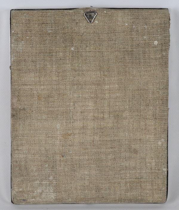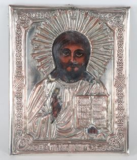 "Christ Pantocrator" Russian icon painted on wood, with a silver-plated, chiseled and embossed metal riza
