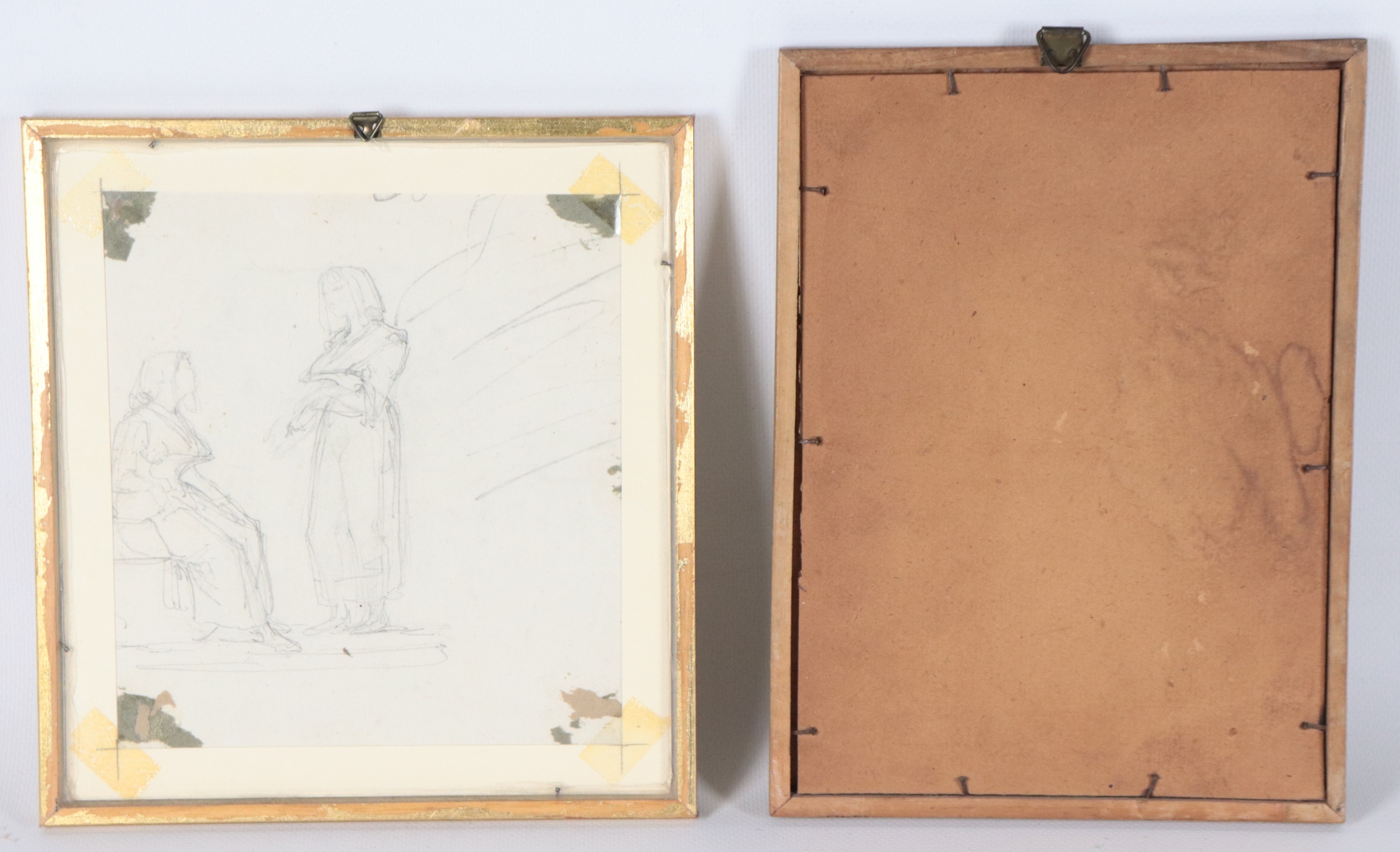 lot of two ancient small drawings on paper in pencil and inkWooden frames. Maximum size 17 x 16 cm.