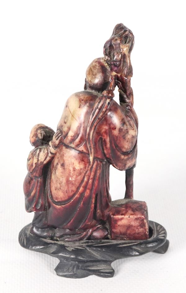 "Holy Man with Child", small Chinese soapstone sculpture with teak base, defects