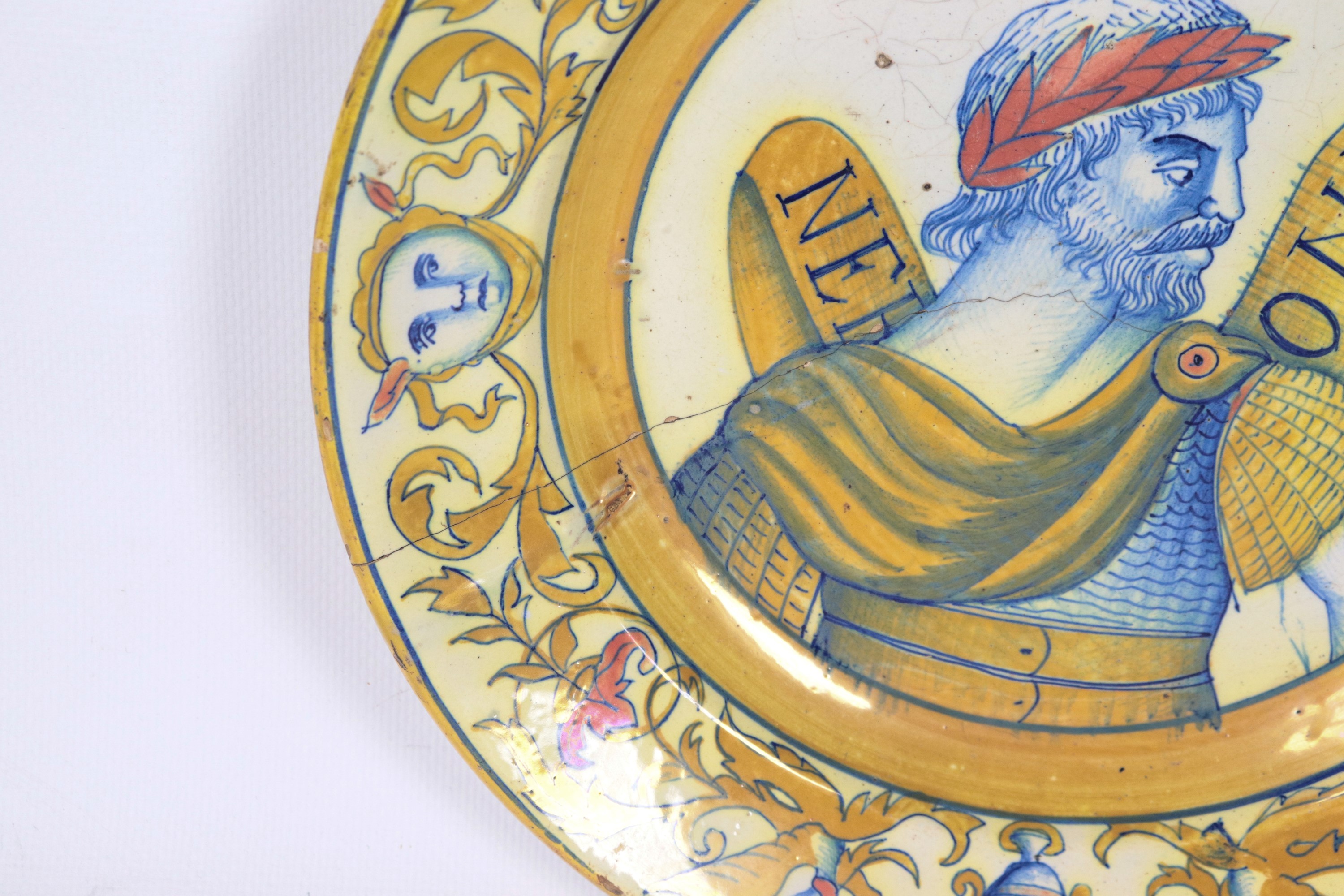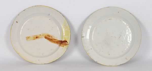 "Nerone" and "Edora", a pair of antique Deruta glazed majolica wall plates with polychrome decorations