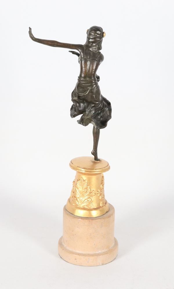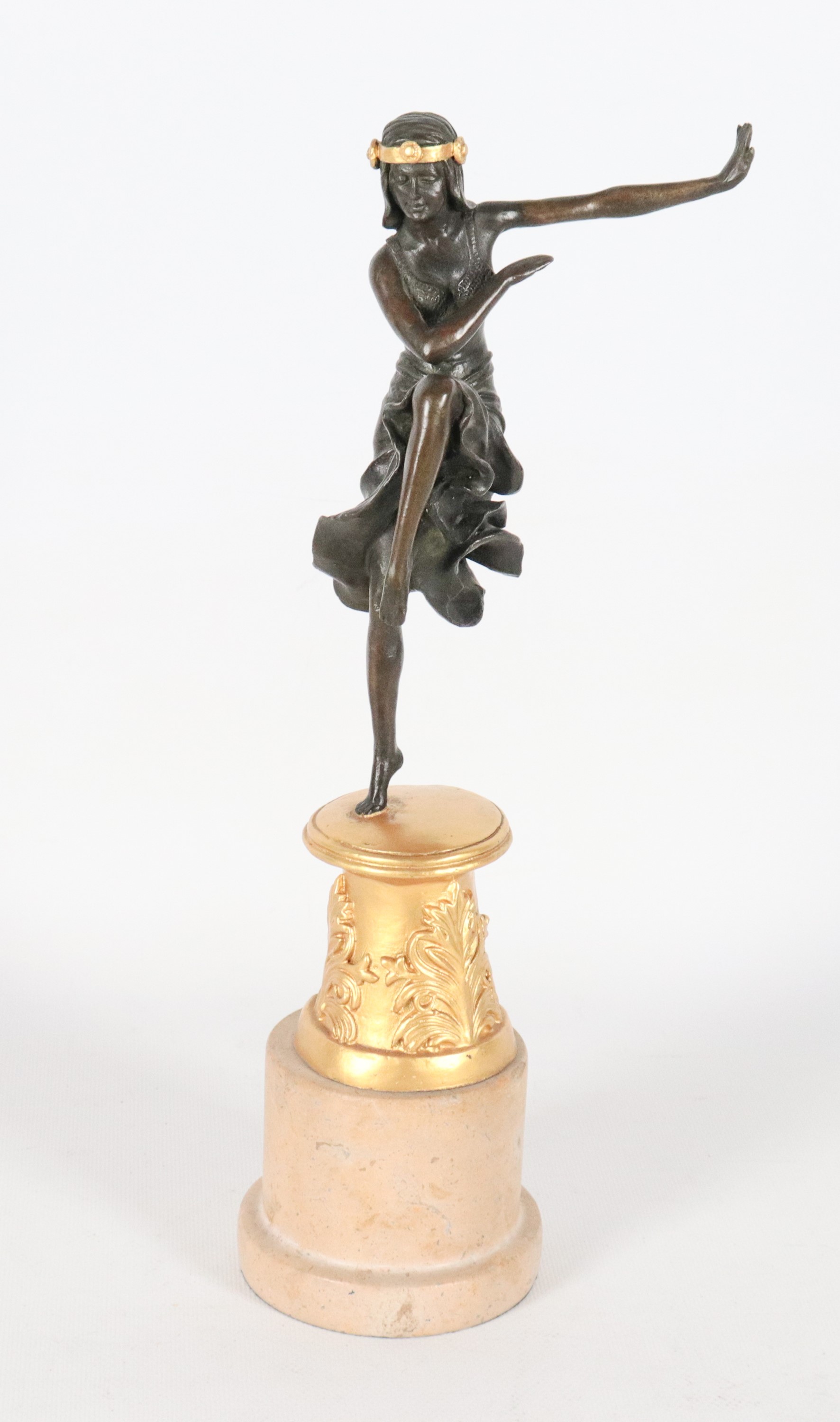 "Odalisca", a small Art Nouveau bronze sculpture, with a gilded base resting on a section of a marble column