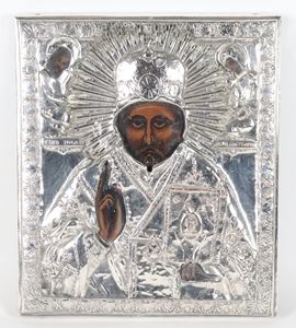 "Saint Nicholas", Russian icon painted on wood, with a silver-plated, embossed and chiseled metal riza