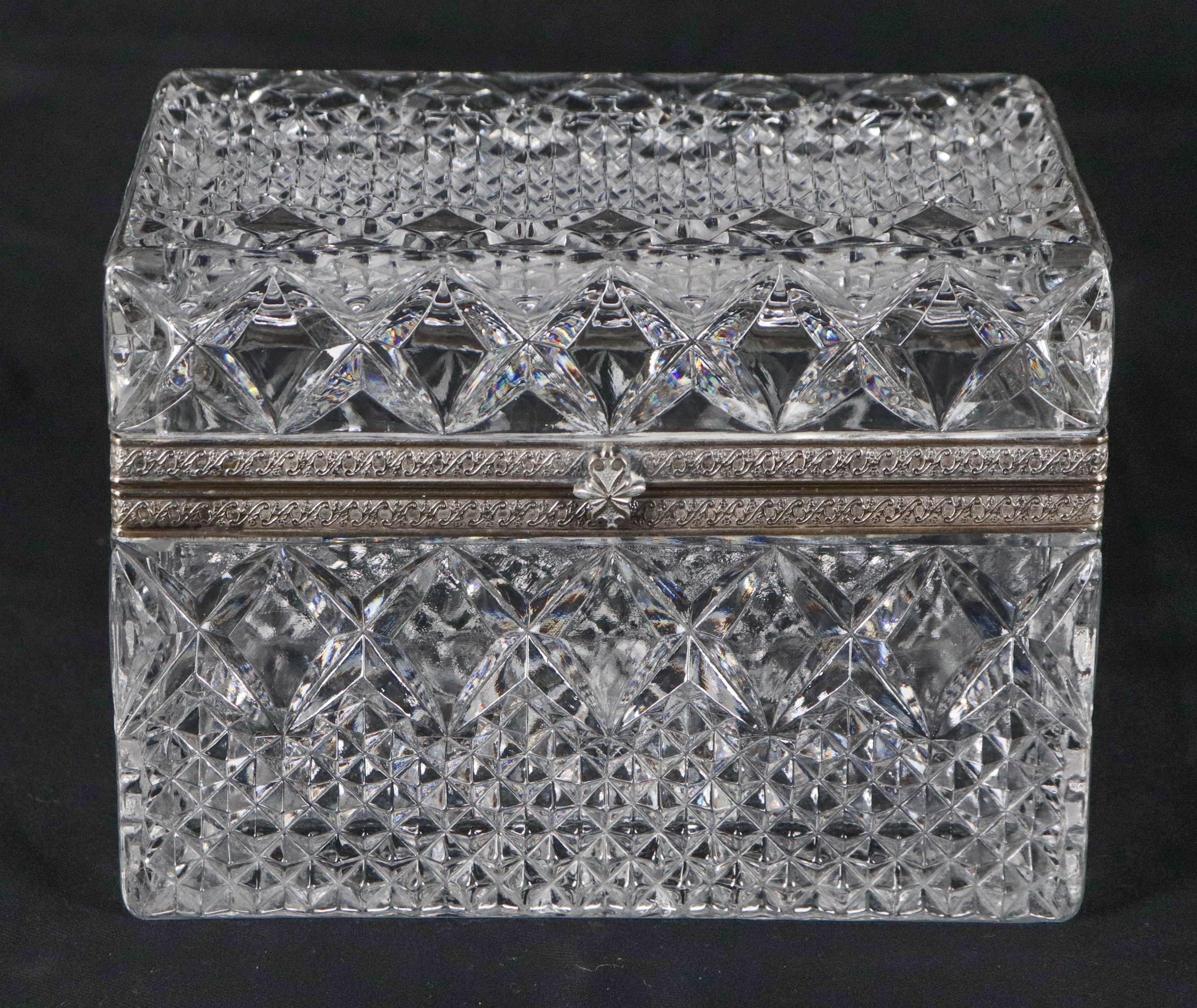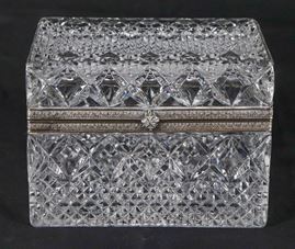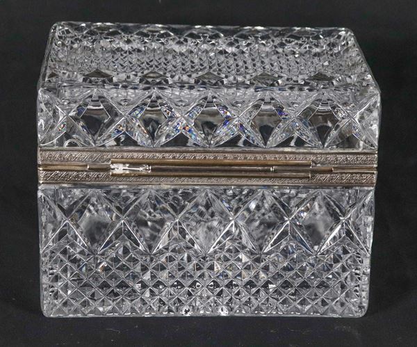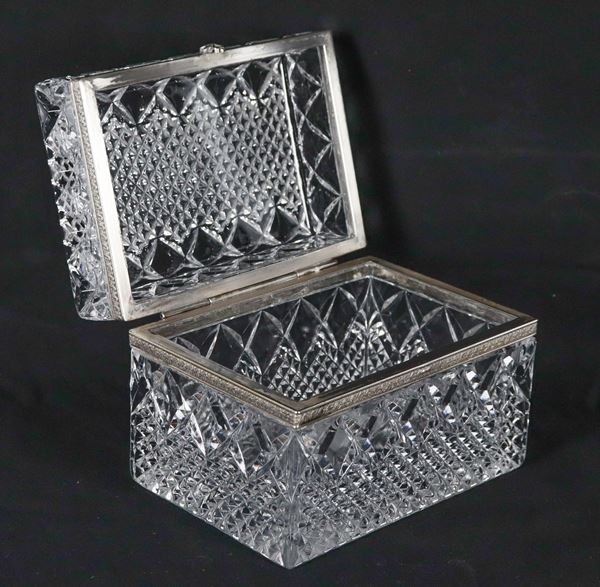 Rectangular box in diamond-cut crystal, with silver-plated metal trim