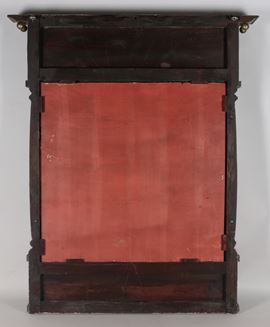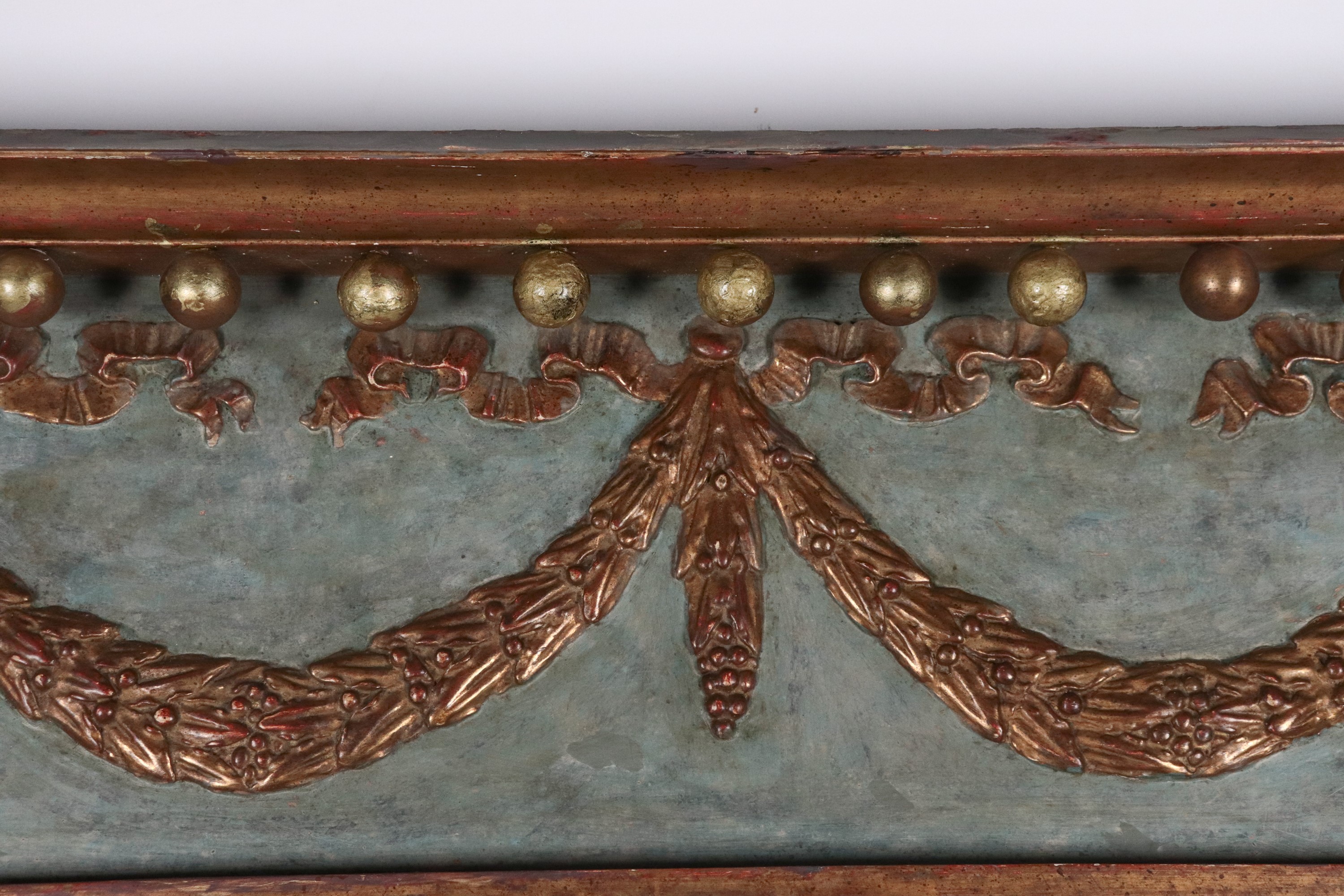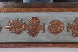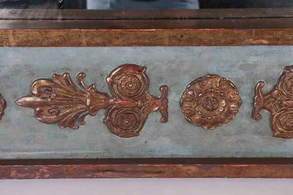 Roman Empire style mirror, in light blue lacquered wood with garlands and columns in gilded and carved wood