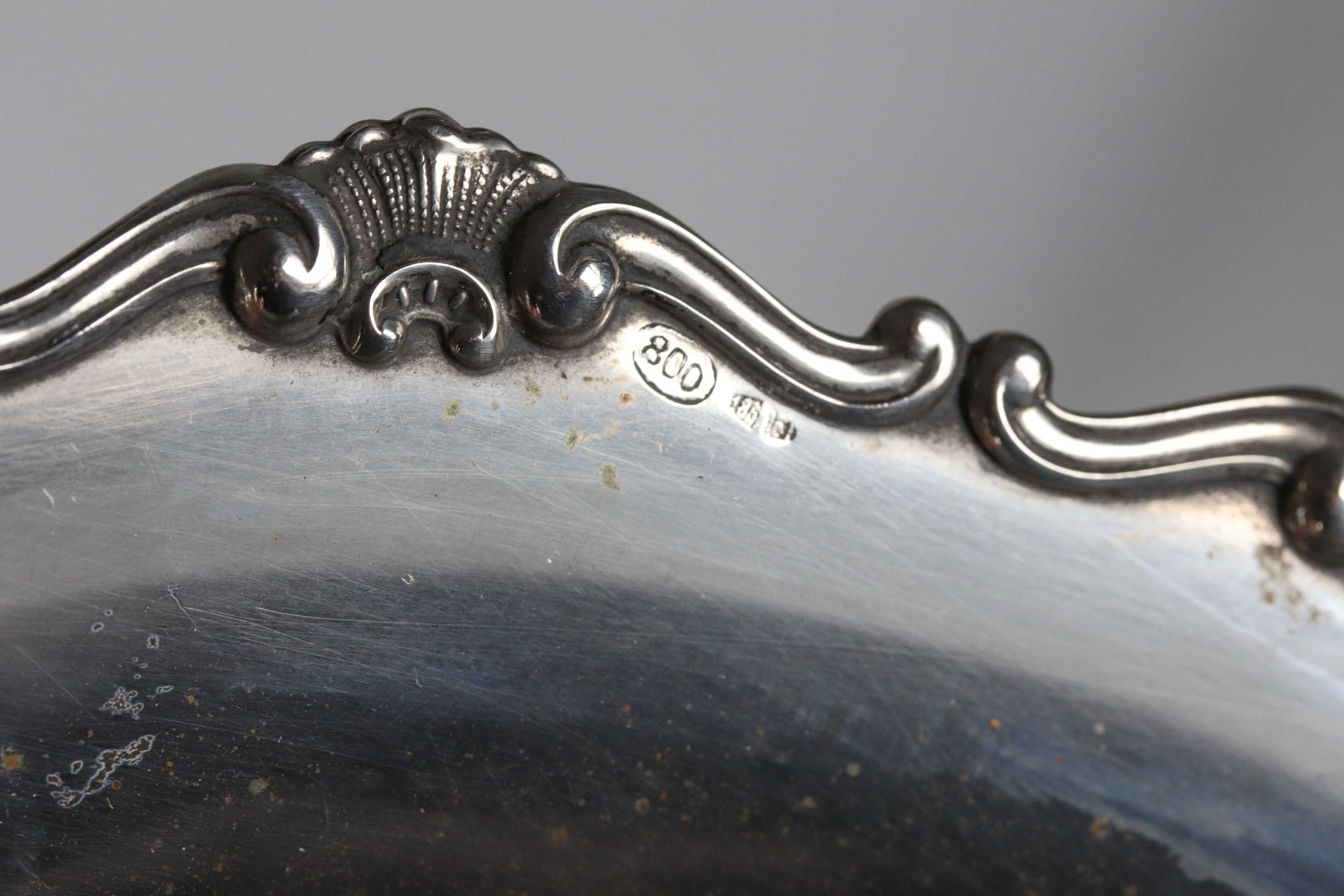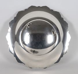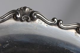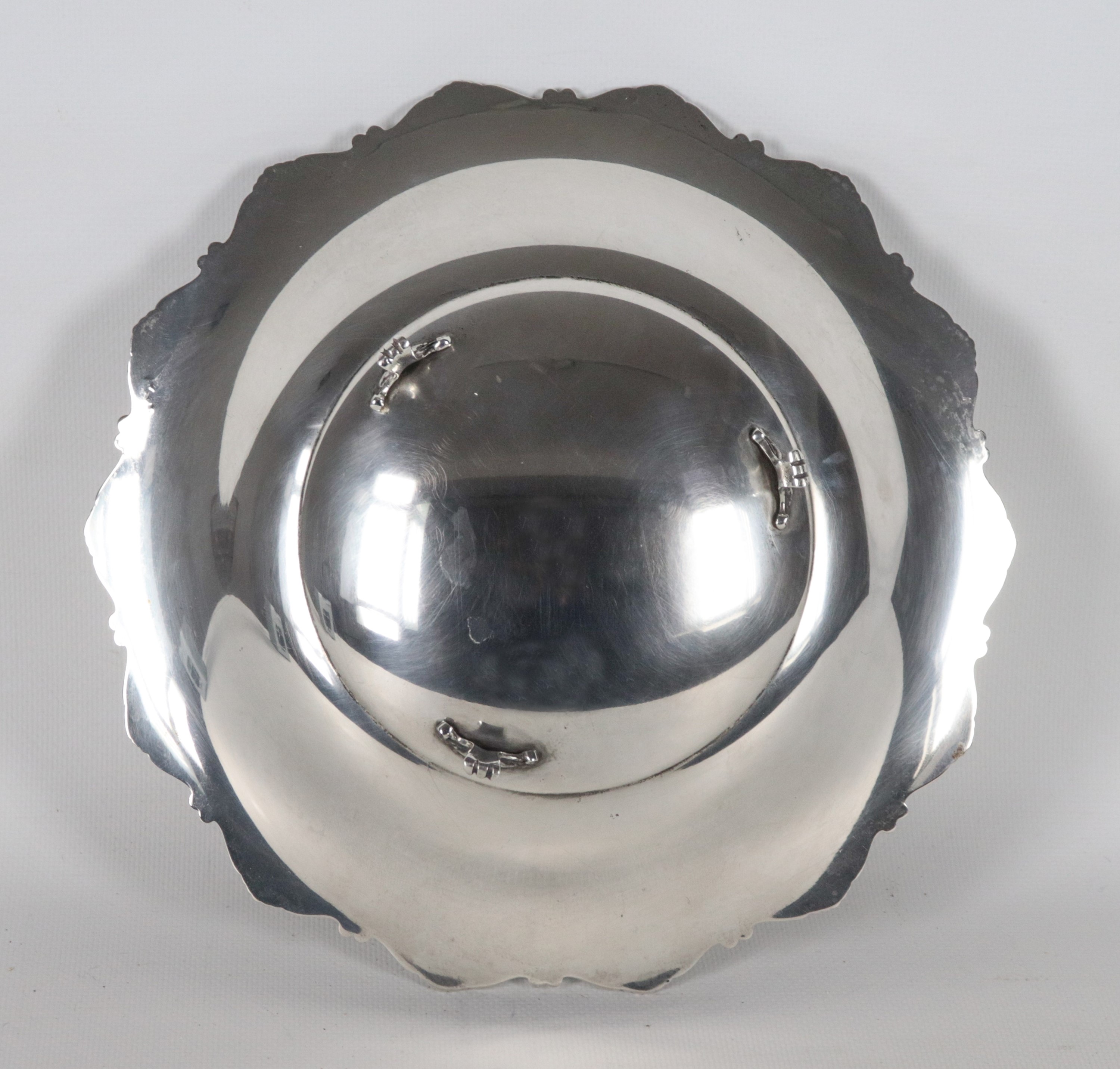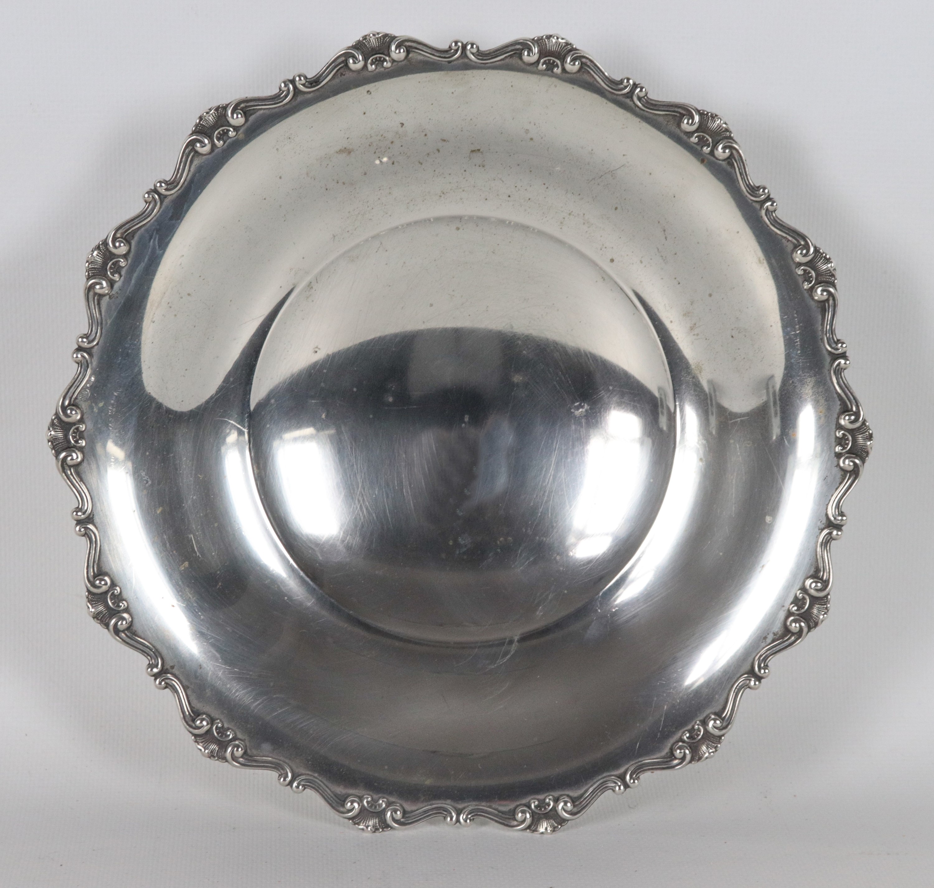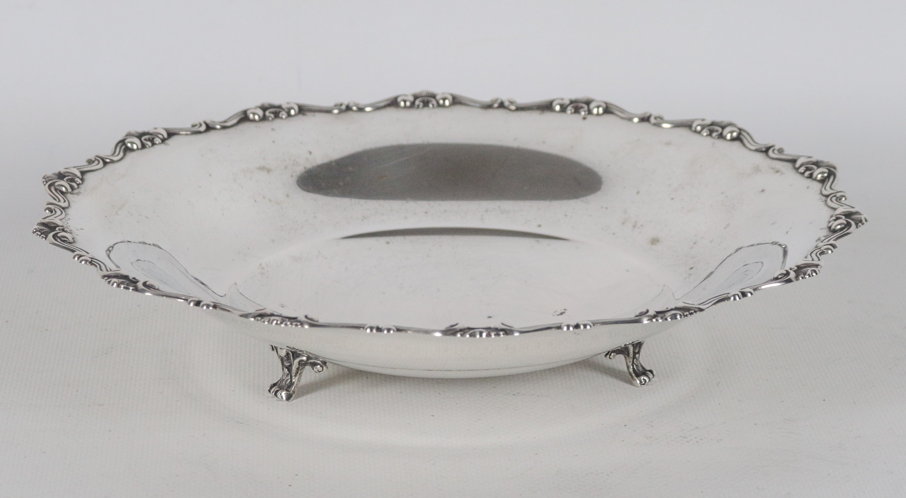Round silver fruit bowl, with a chiseled and embossed edge featuring scroll and shell motifs, supported by three curved feet, 290 g