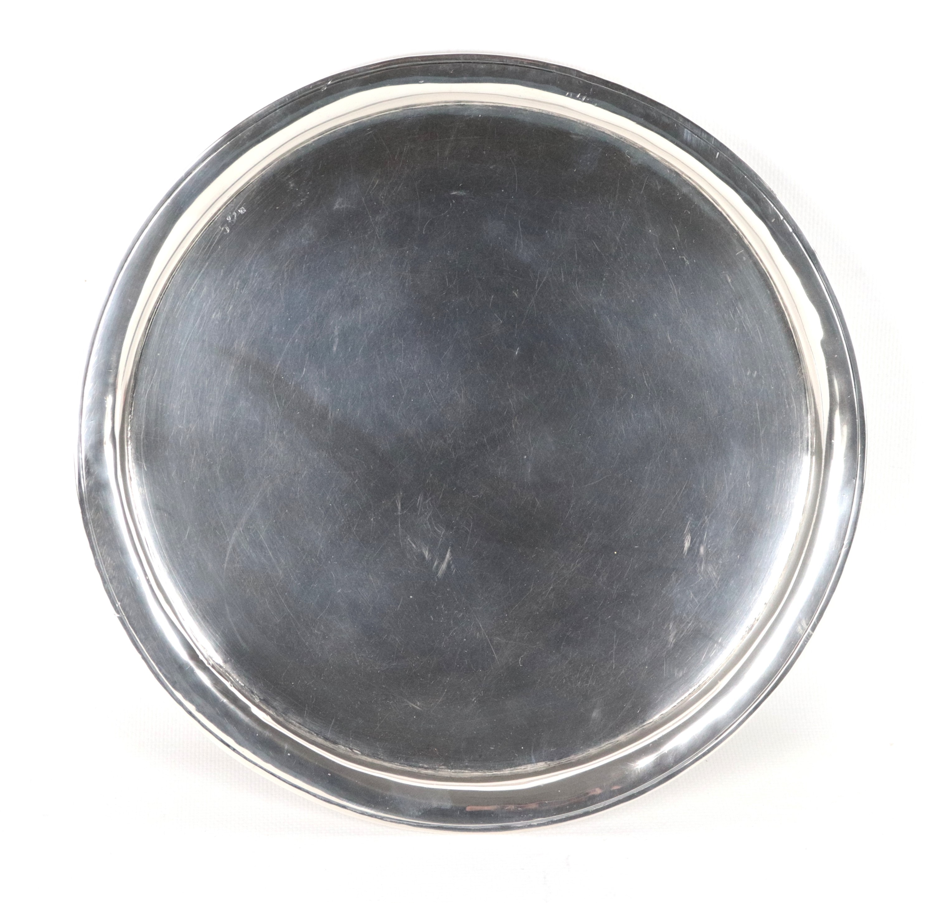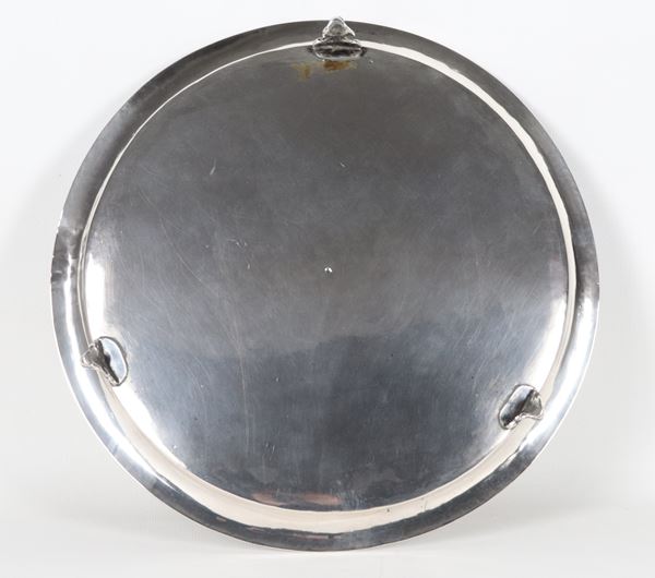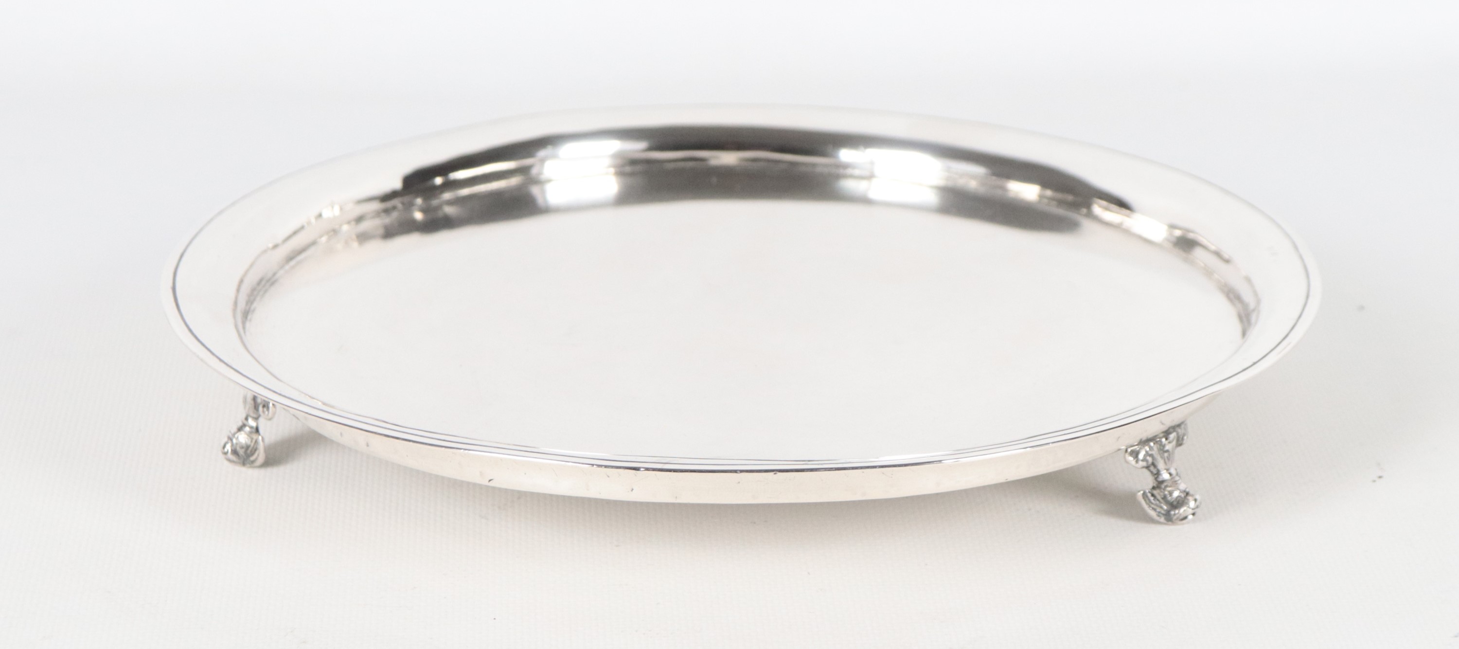 Round silver metal salver, supported by three curved feet