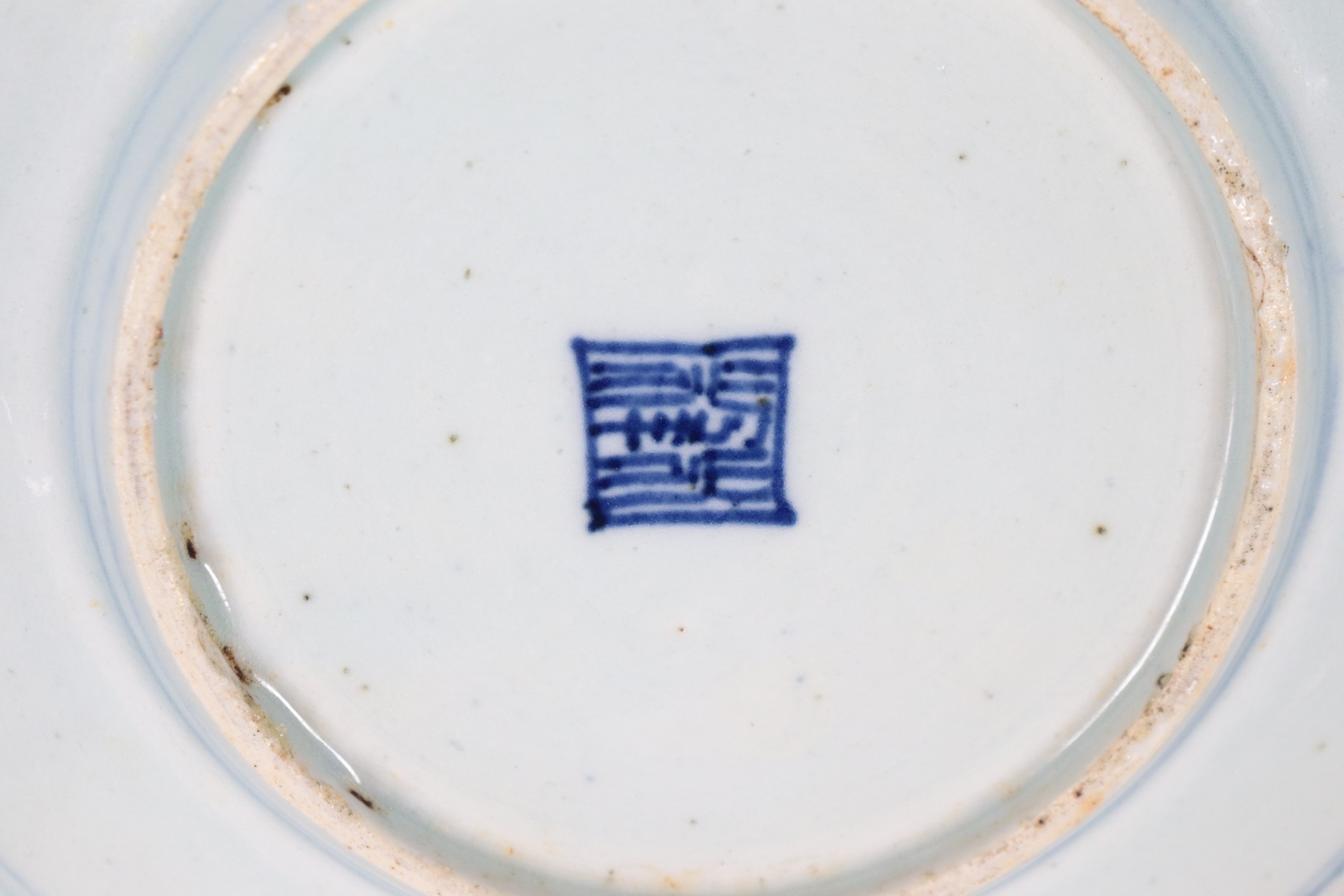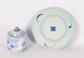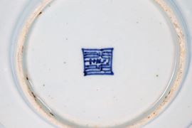 Set of 2 blue and white Chinese porcelain sugar bowls and round saucers.