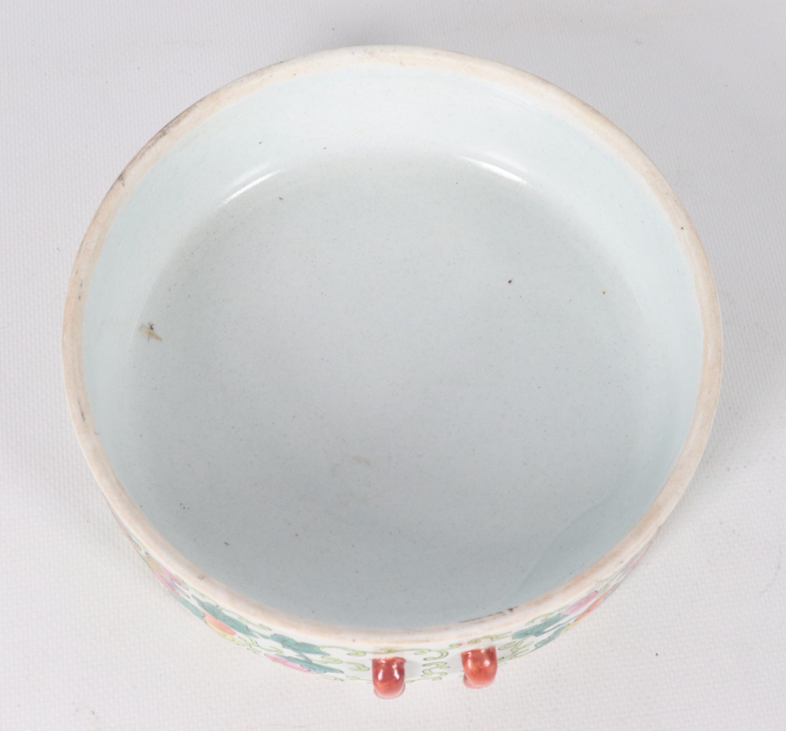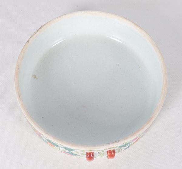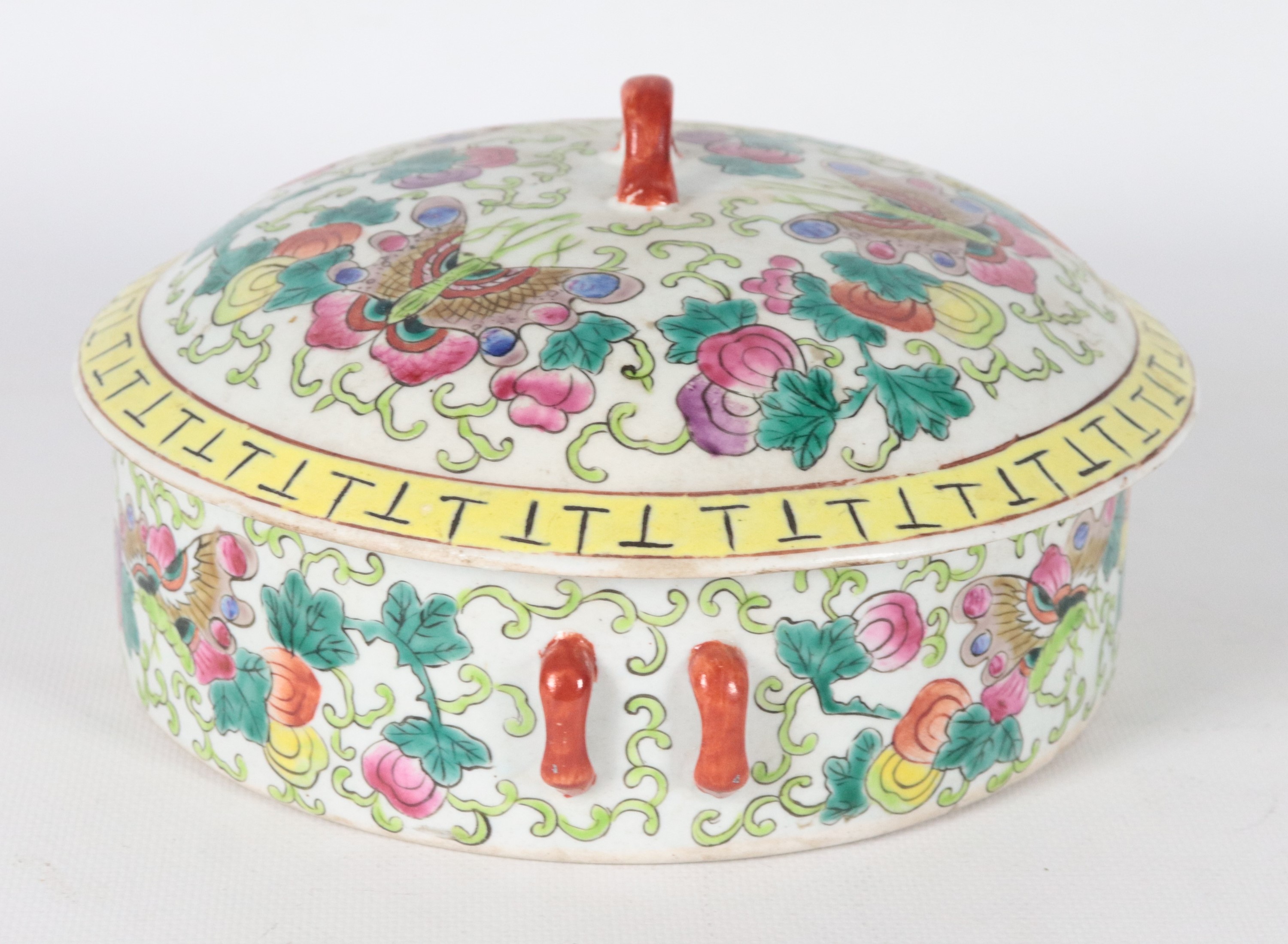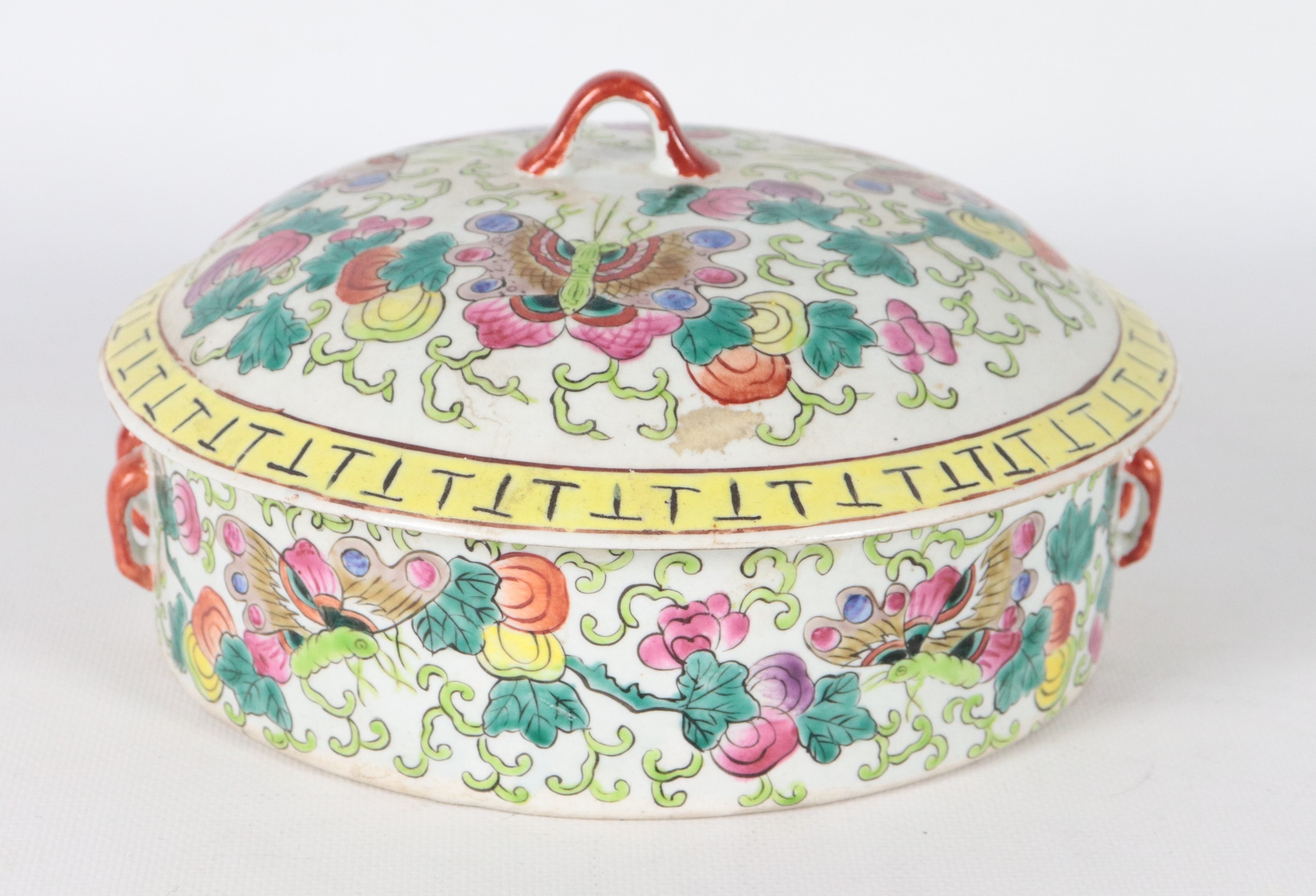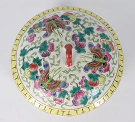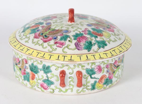 Small Chinese porcelain tureen, with polychrome enamel decorations in relief with flower and leaf motifs