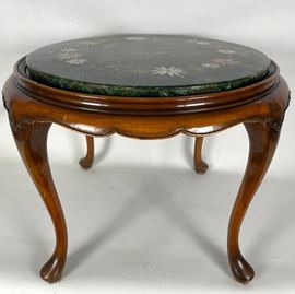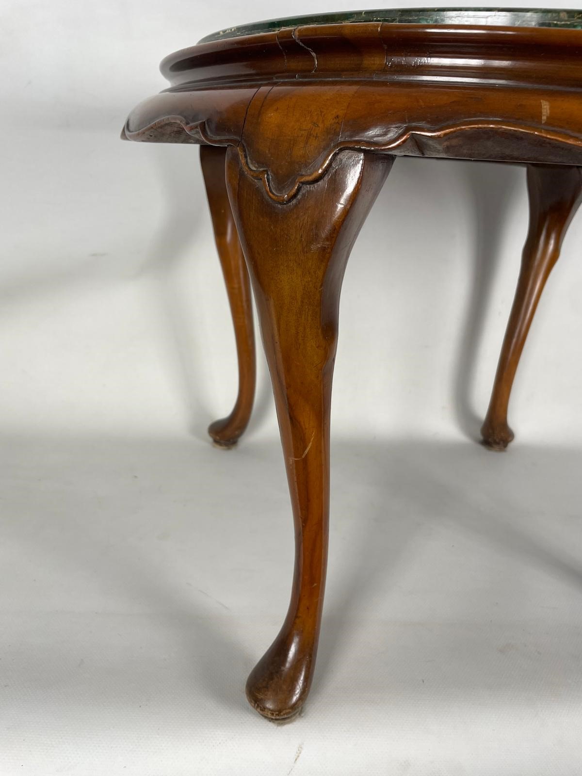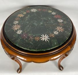 Small low round table in mahogany, with marble top inlaid with polychrome floral motifs and four curved legs
