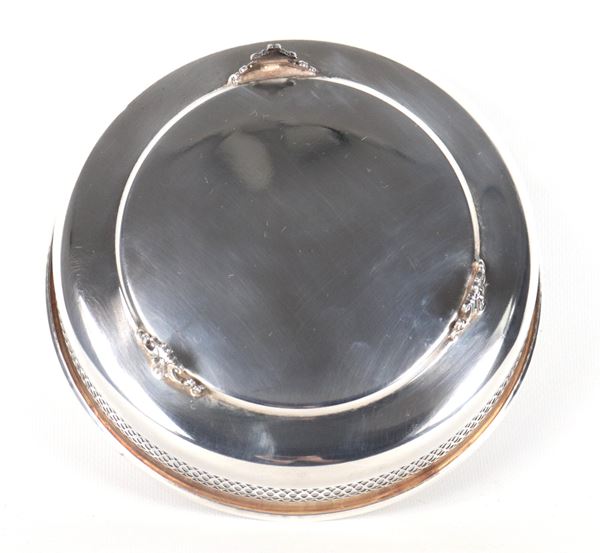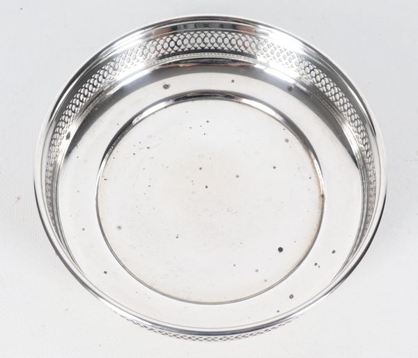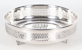 Small round centrepiece in silver metal with a perforated railing edge, supported by three curved feet