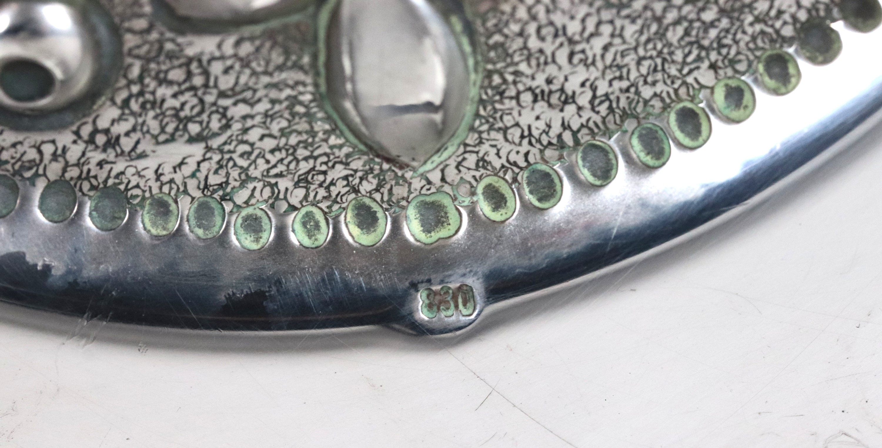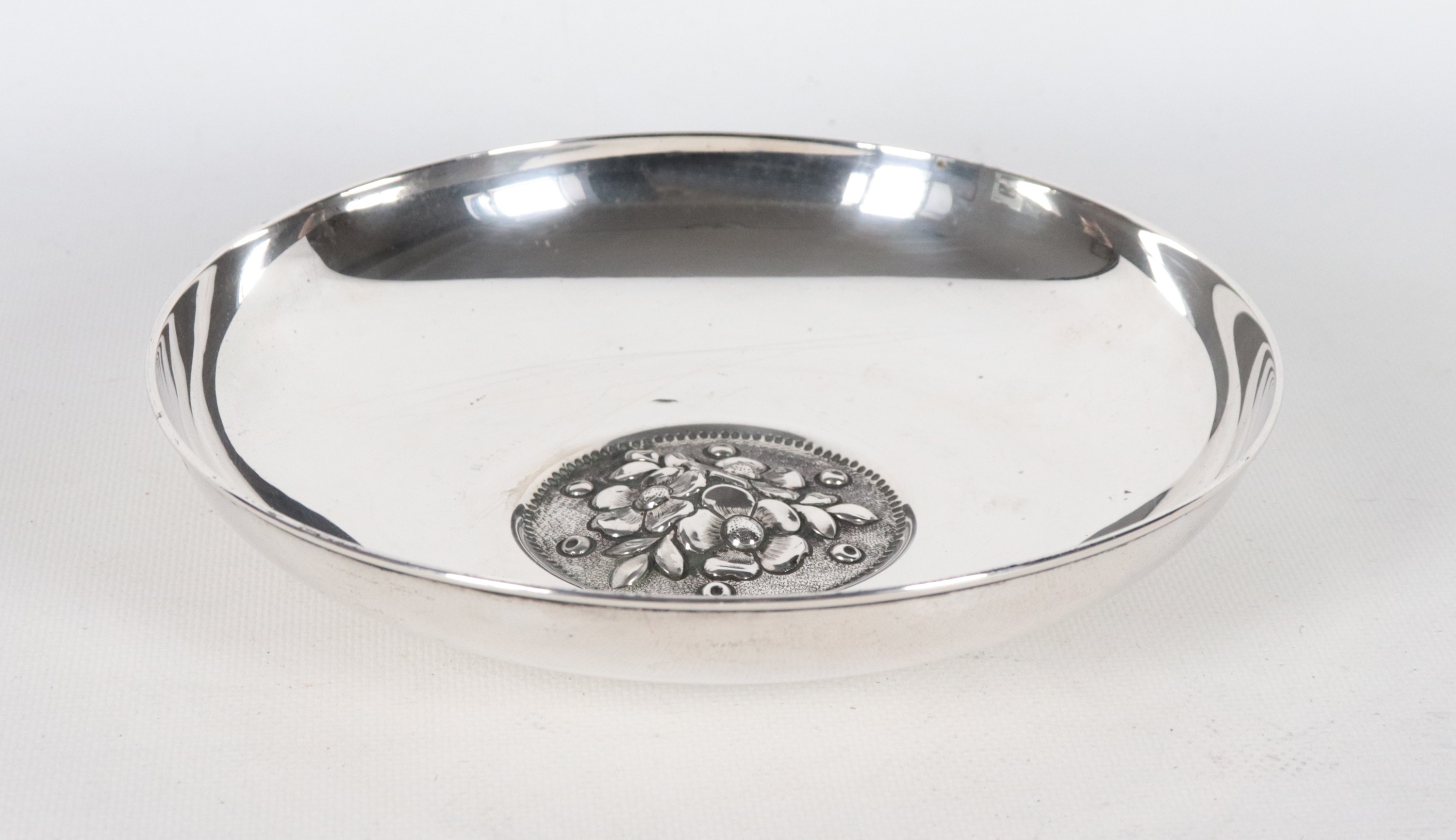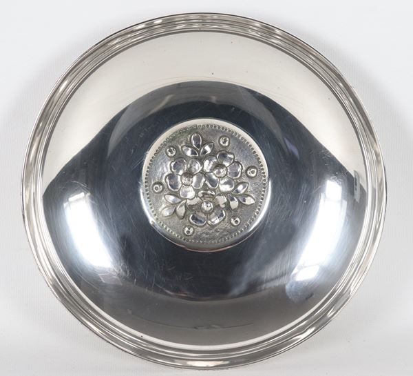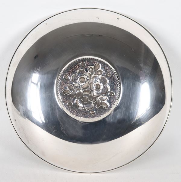 Small round silver centerpiece, with a chiseled and embossed floral motif in the center of the background, 235g