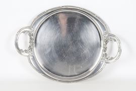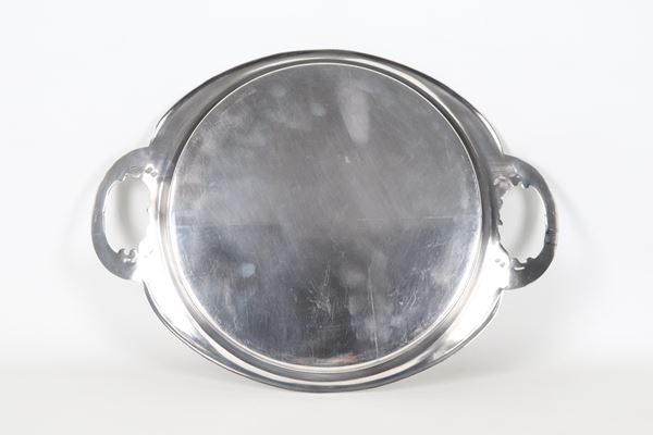 Small round tray from the Art Nouveau period, in silver-plated and embossed metal with two handles