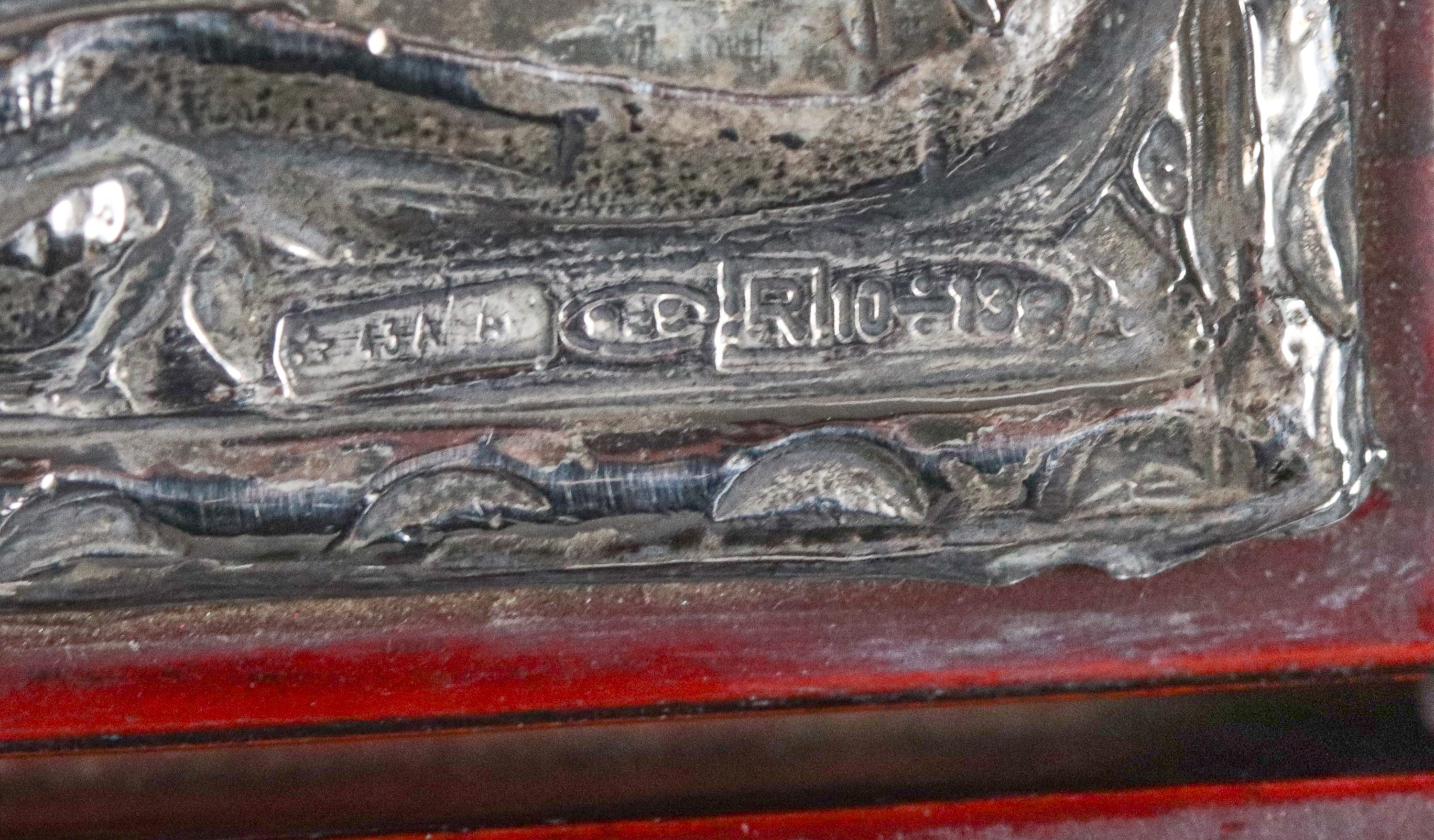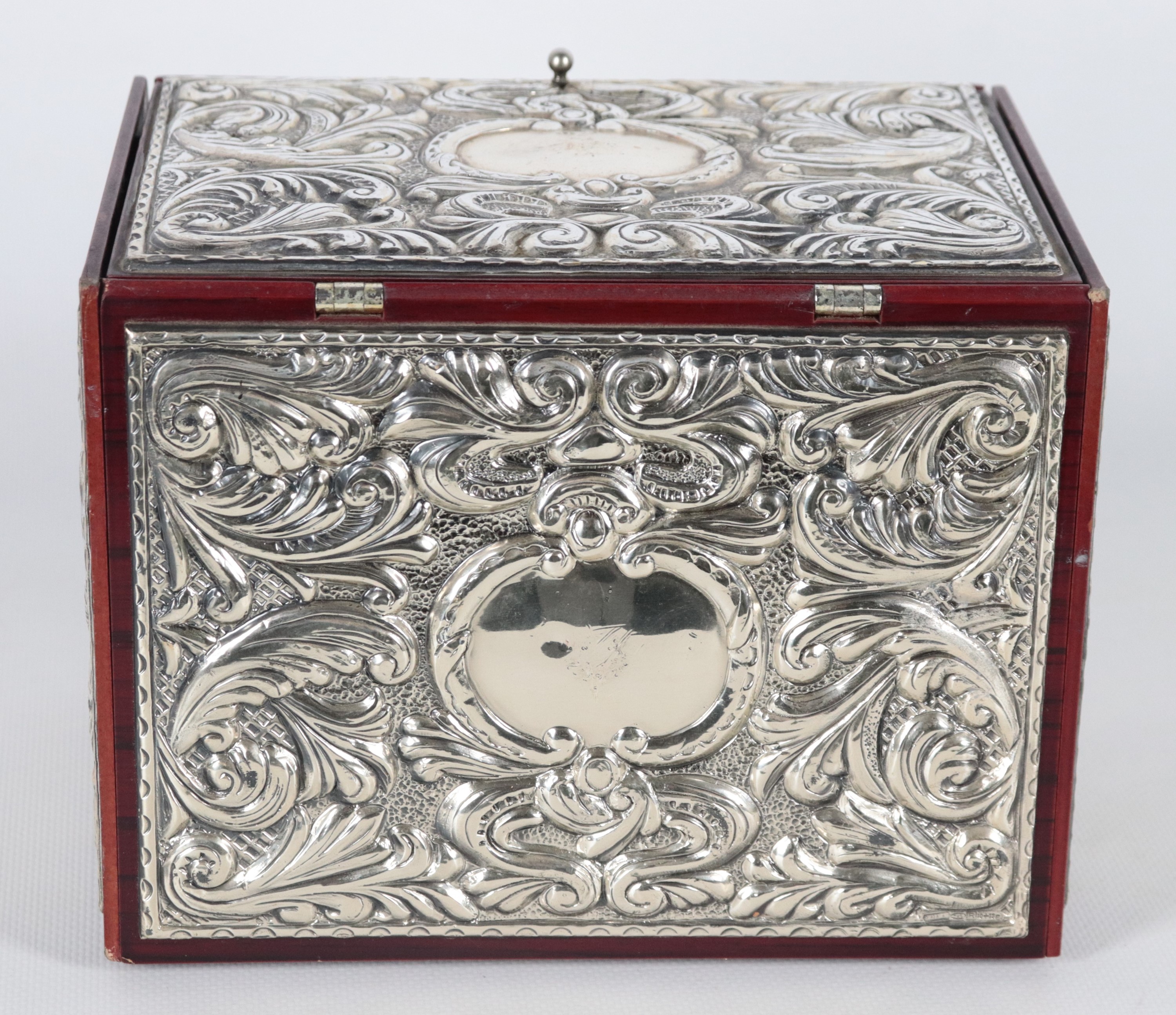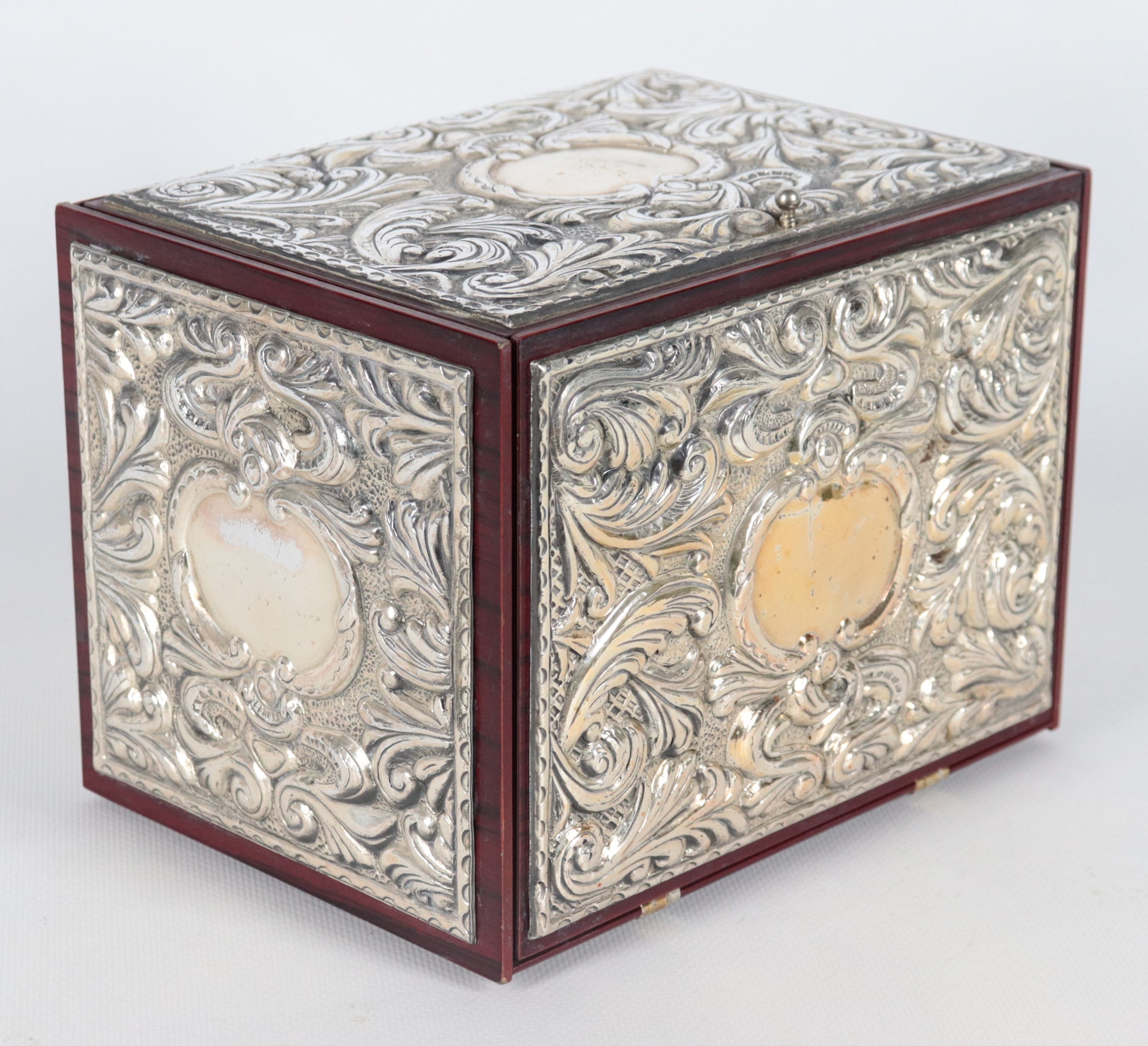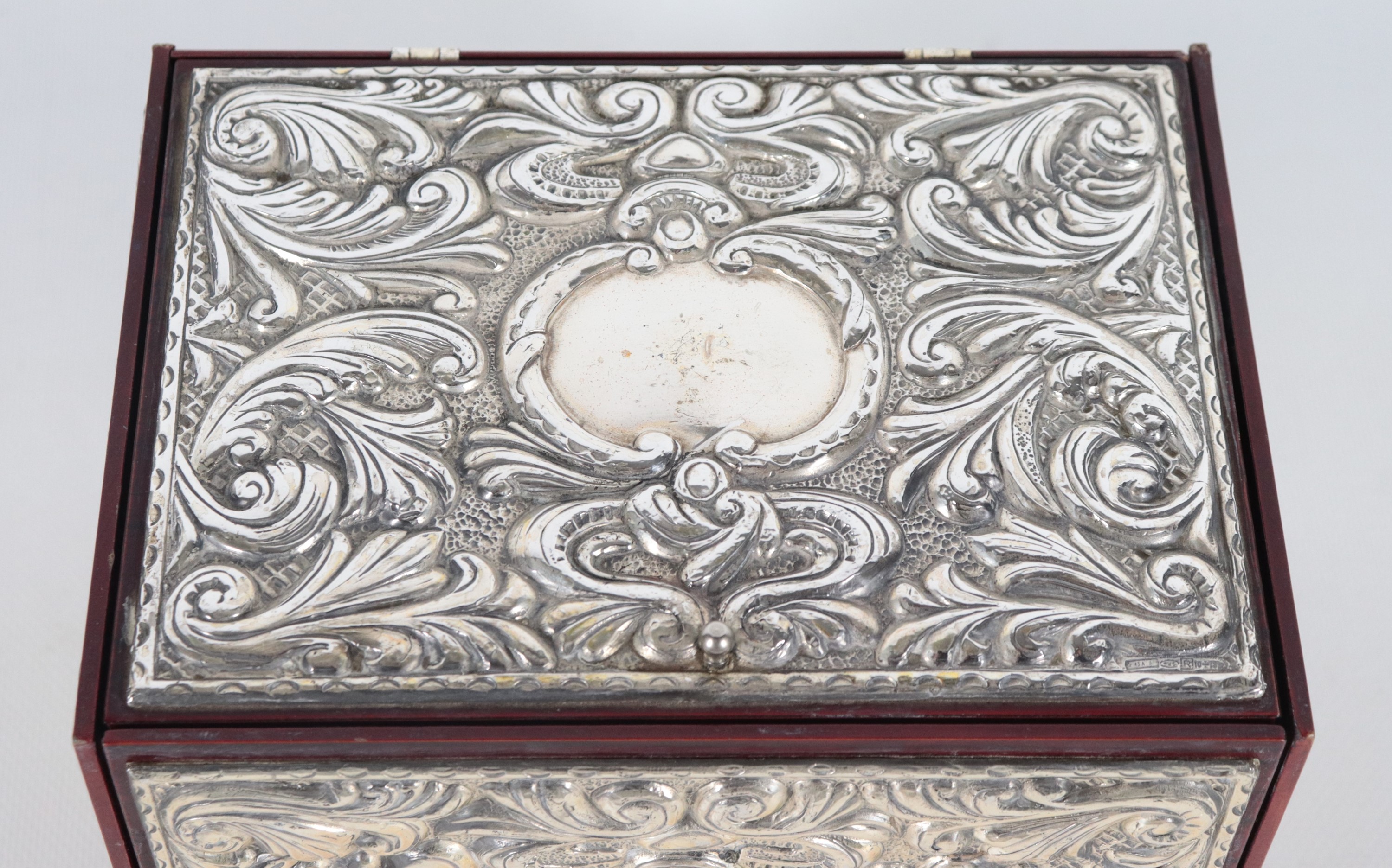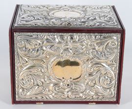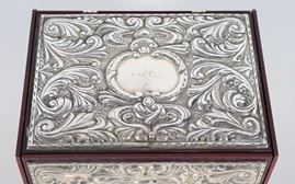Small wooden chest covered in silver with compartments inside