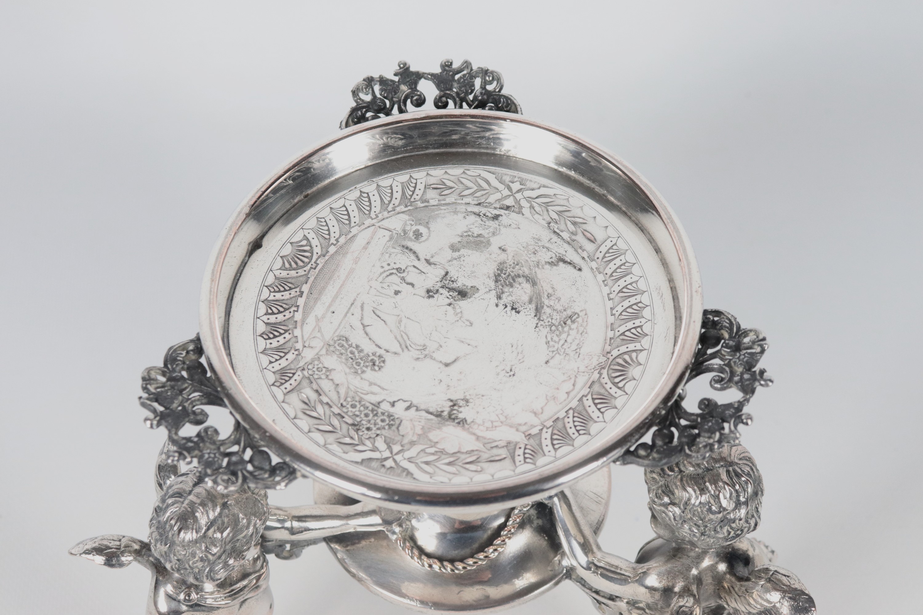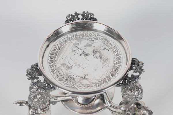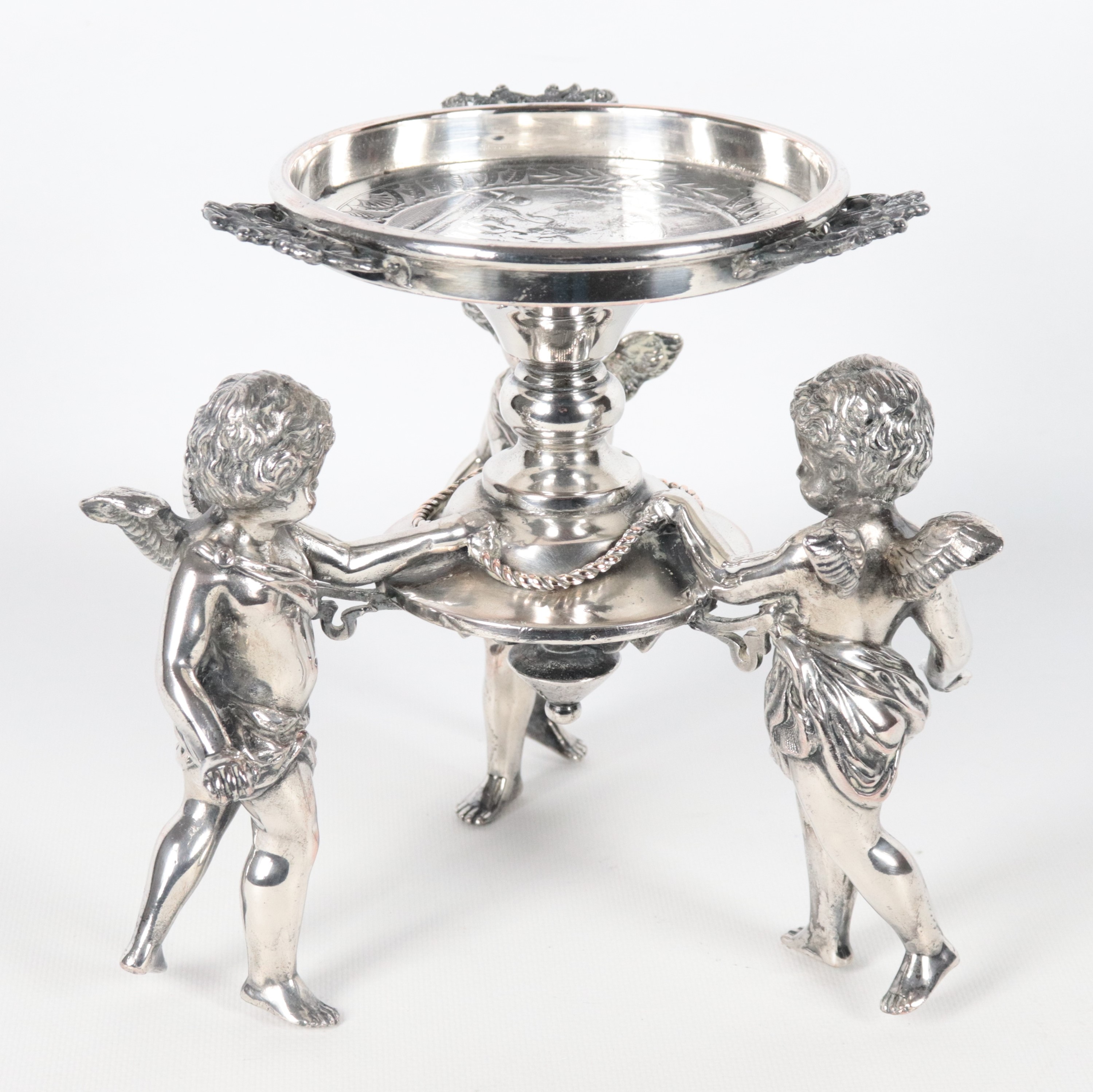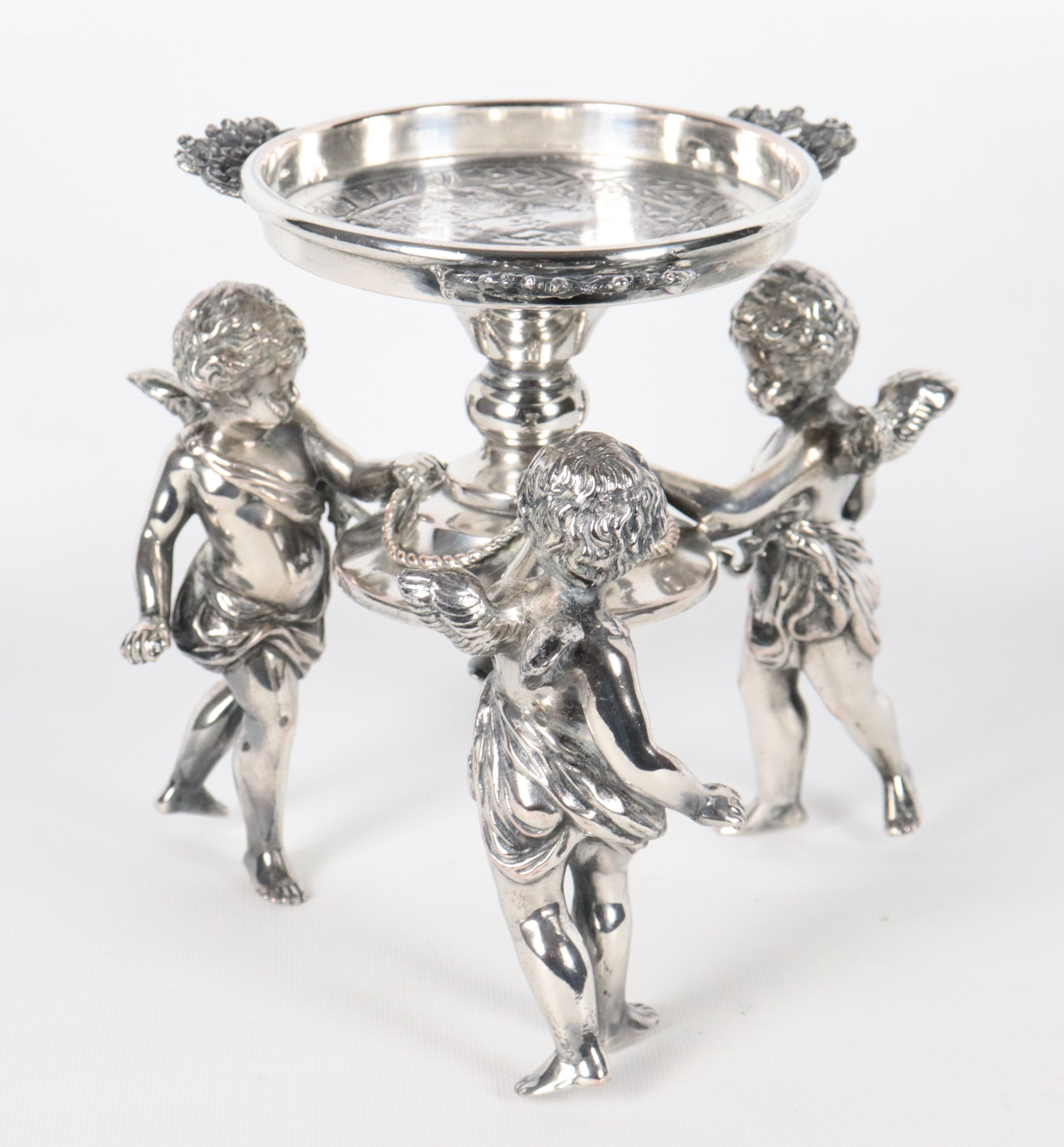 Stand in metal and silvered bronze, with three sculptures of cherubs holding a round bowl