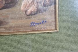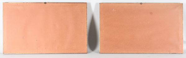 pair of small oil paintings on canvasgilded wooden frames and green passepartout, 18 x 42 cm each.
