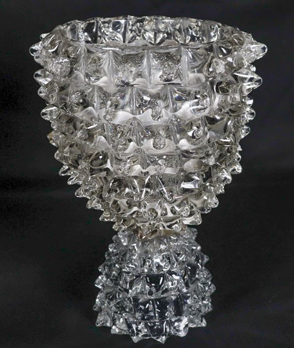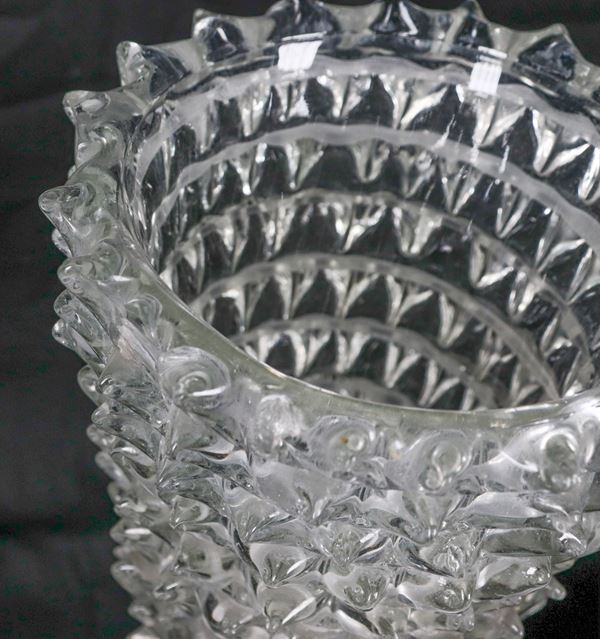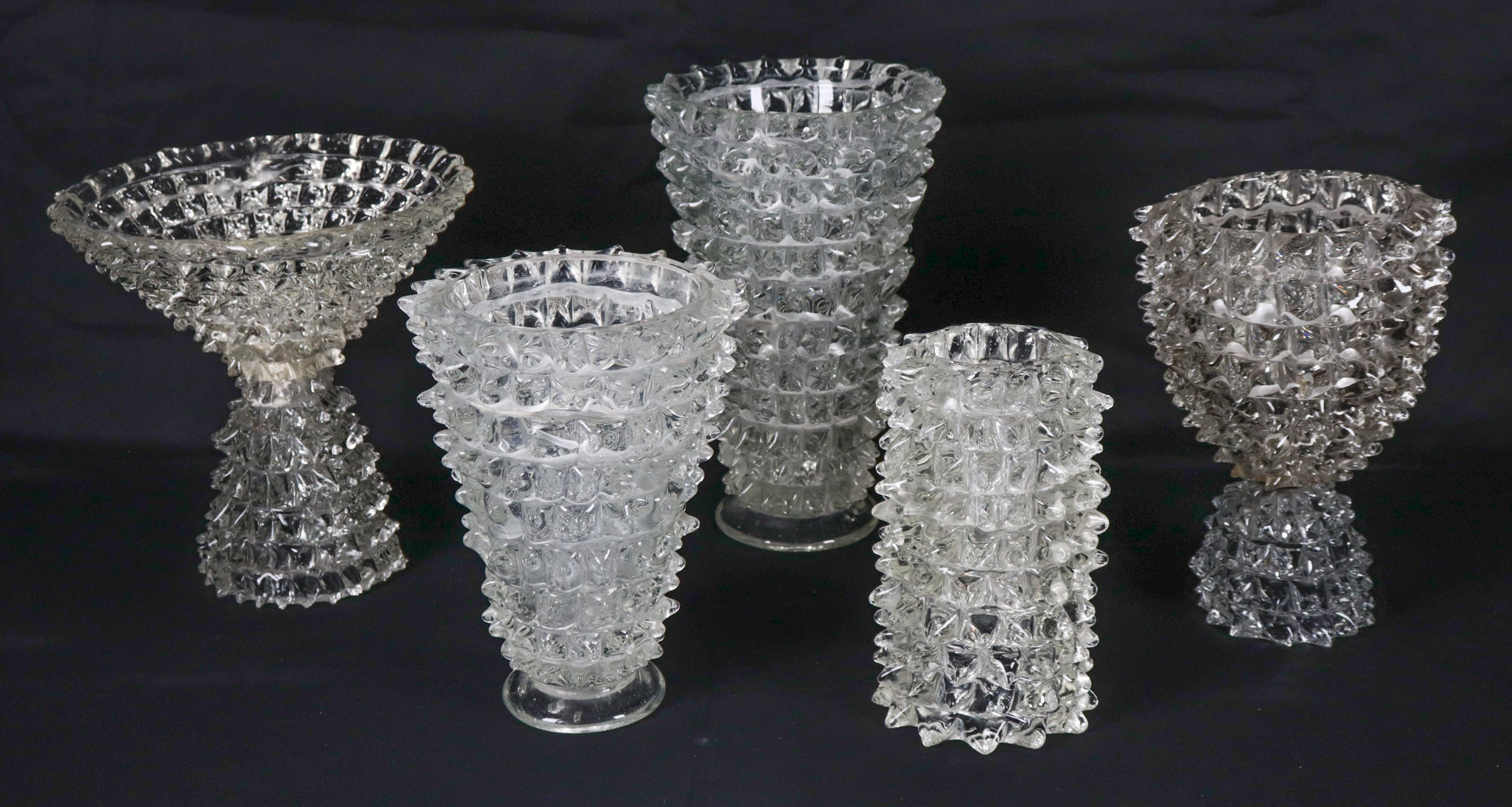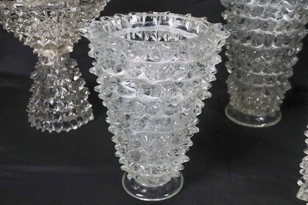Vintage lot of three vases and a stand in Murano rostrato glass, Barovier Toso design (5 pcs.)
