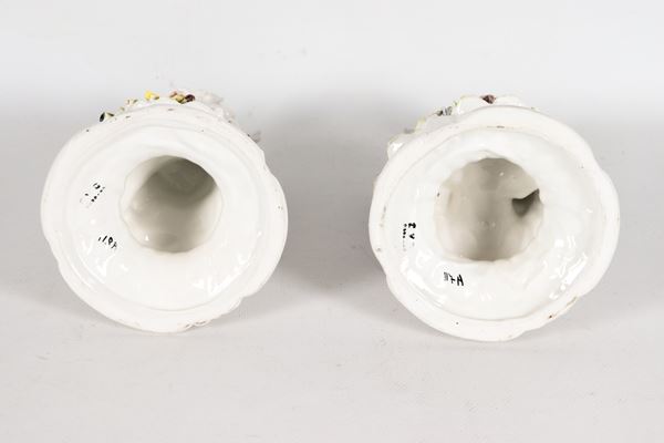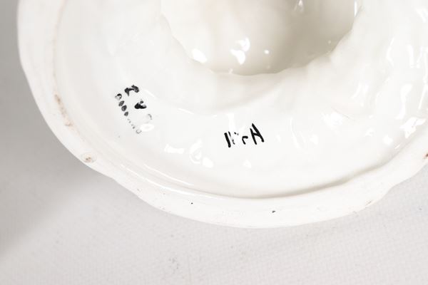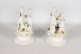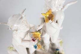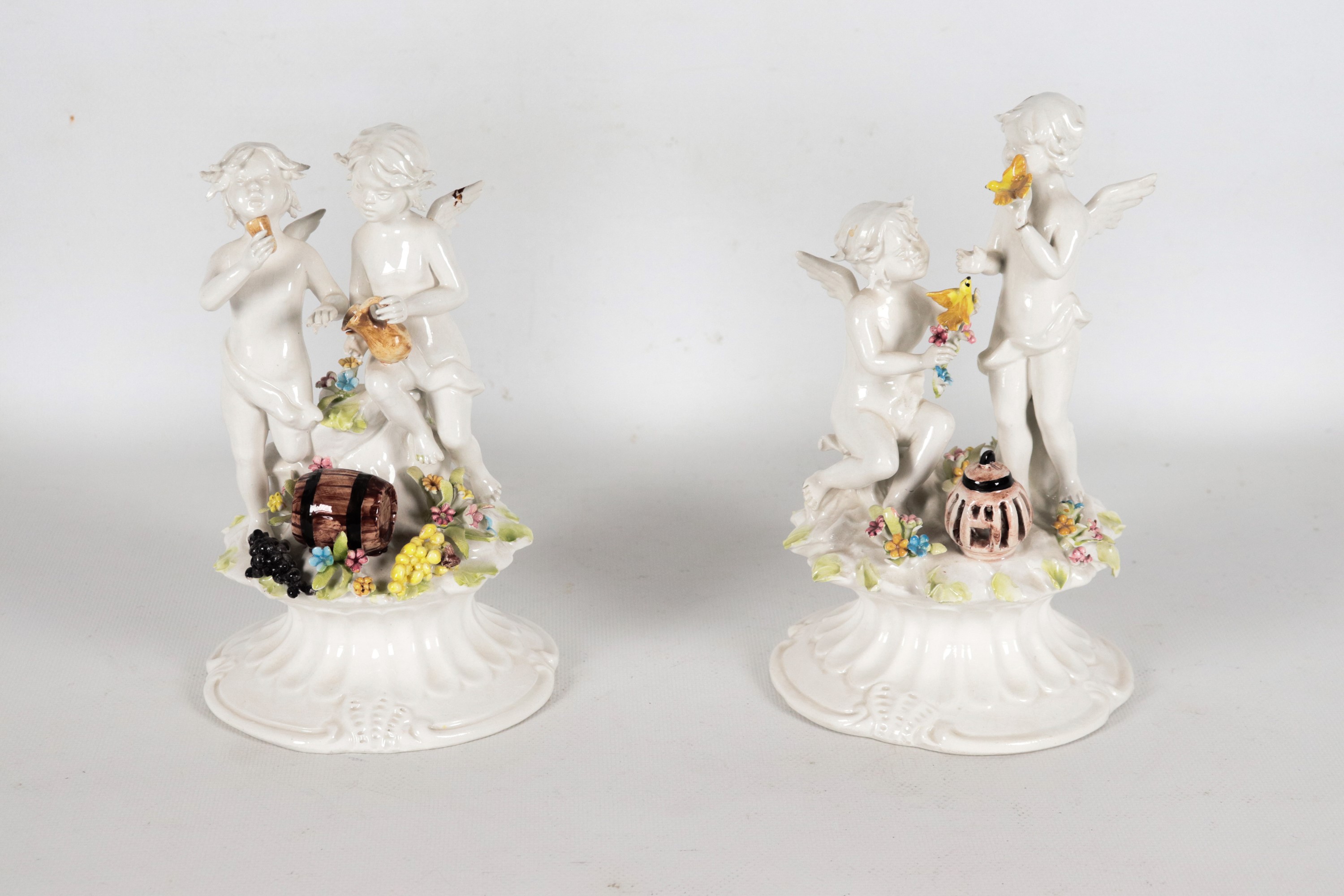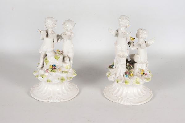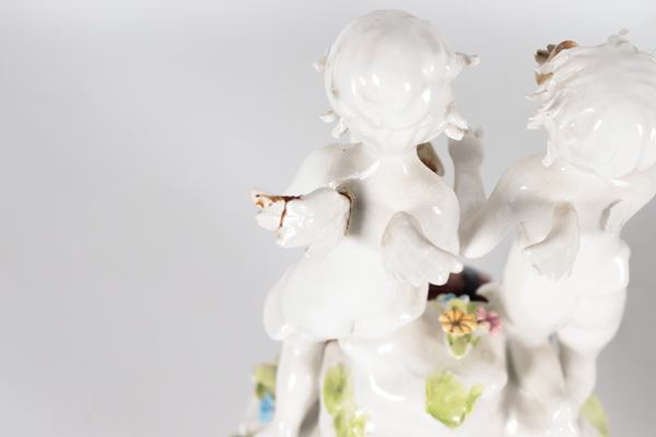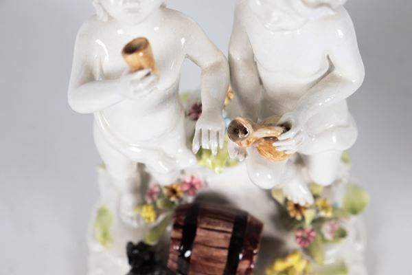 "Allegorie di putti", coppia di piccoli gruppi in ceramica porcellanata Bassano