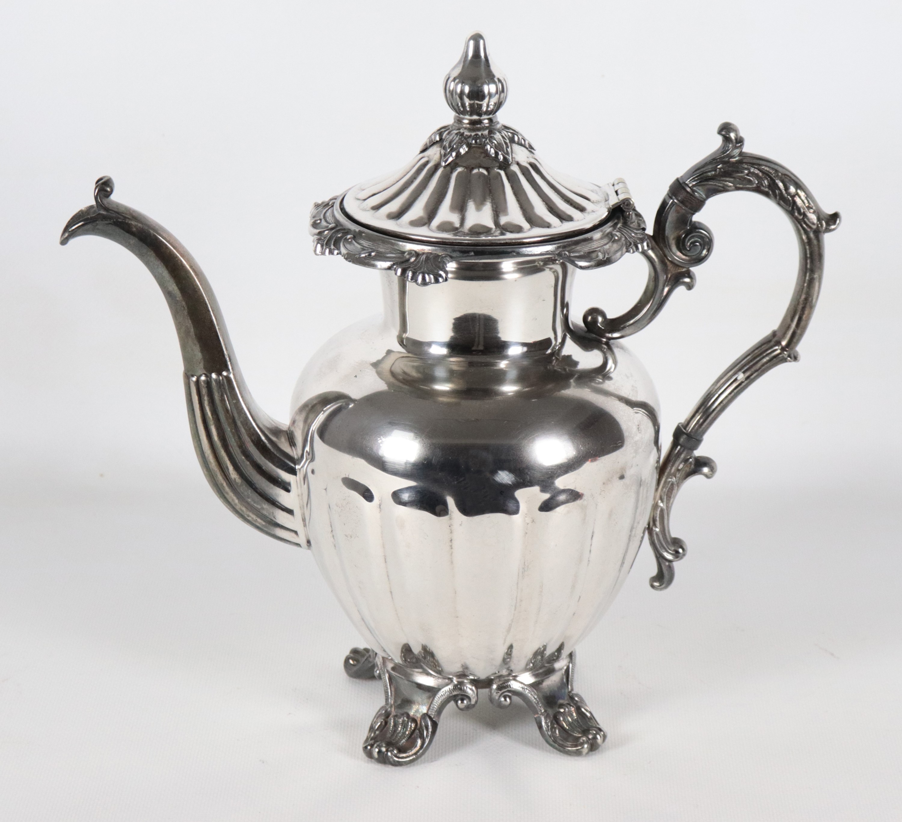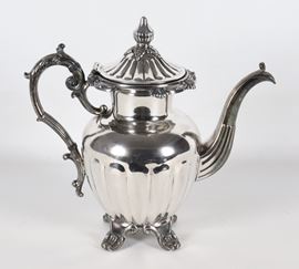 Antica caffettiera in metallo argentato, sbalzato e cesellato, sorretta da quattro piedini ricurvi