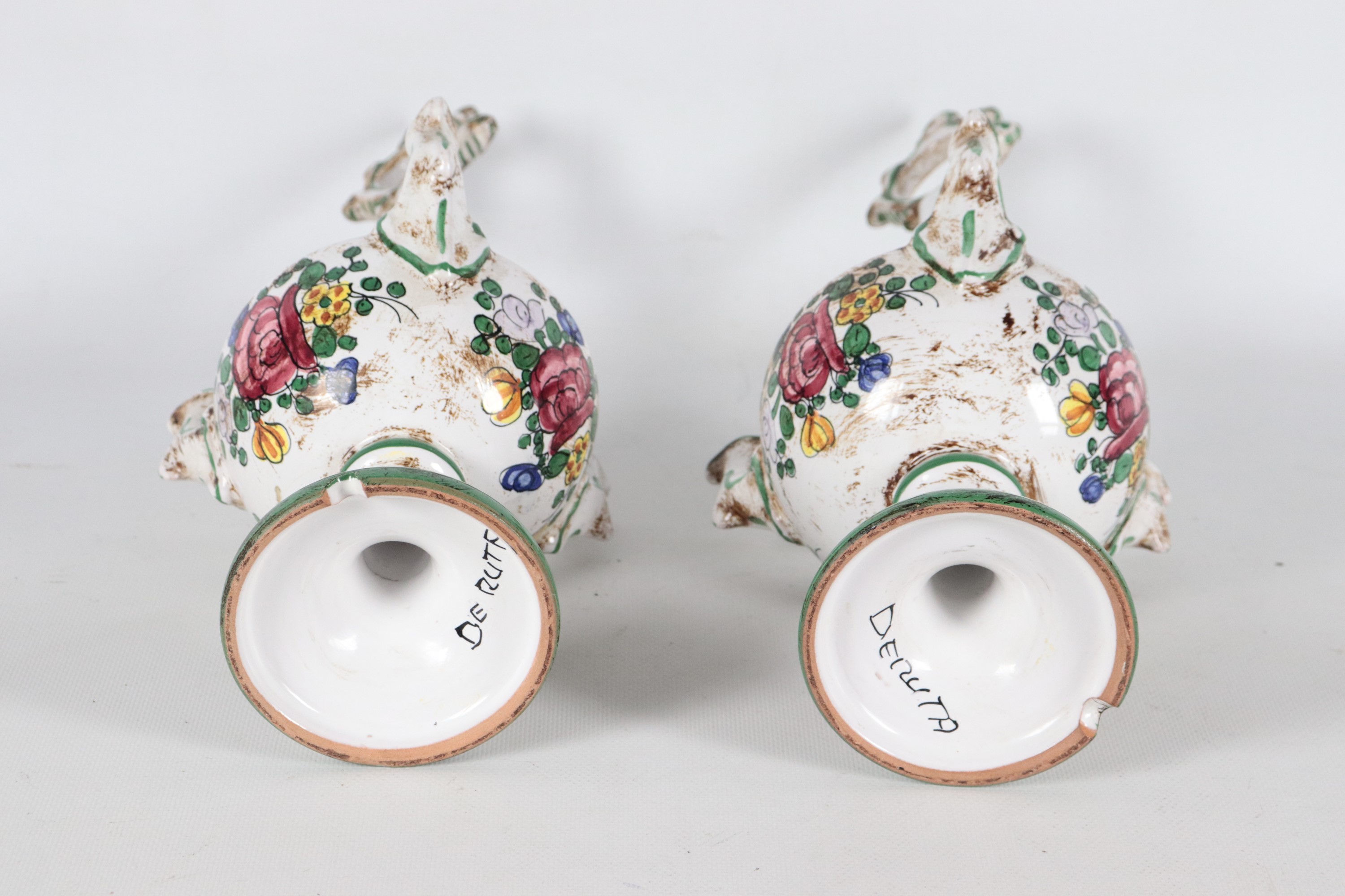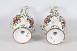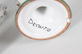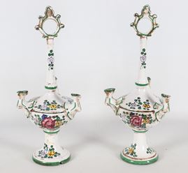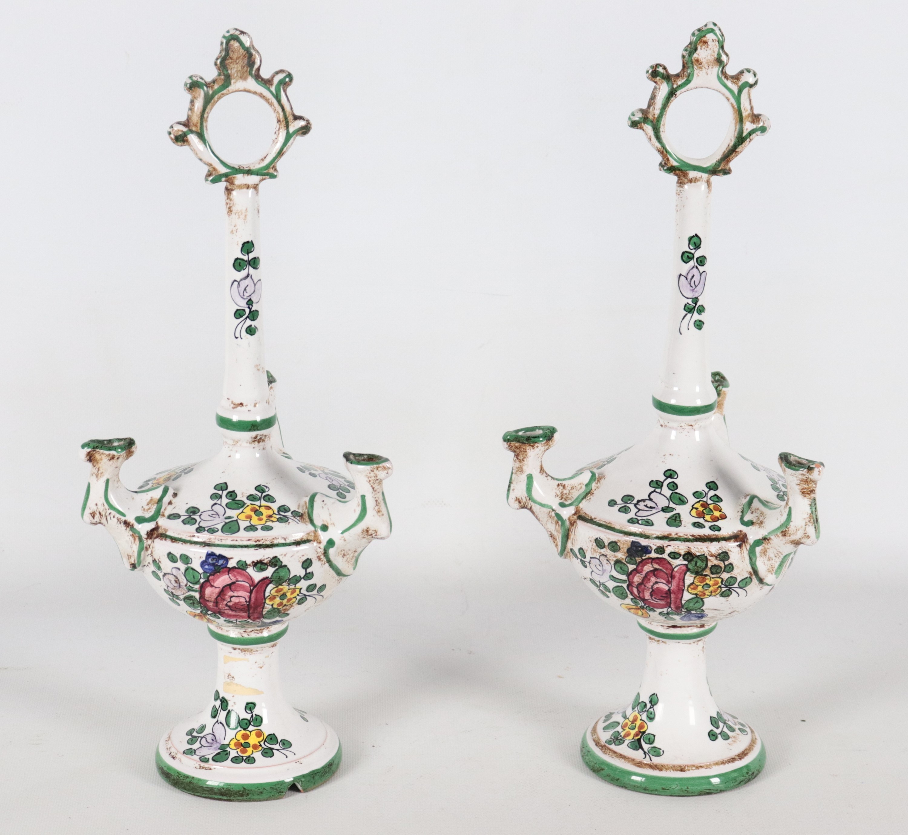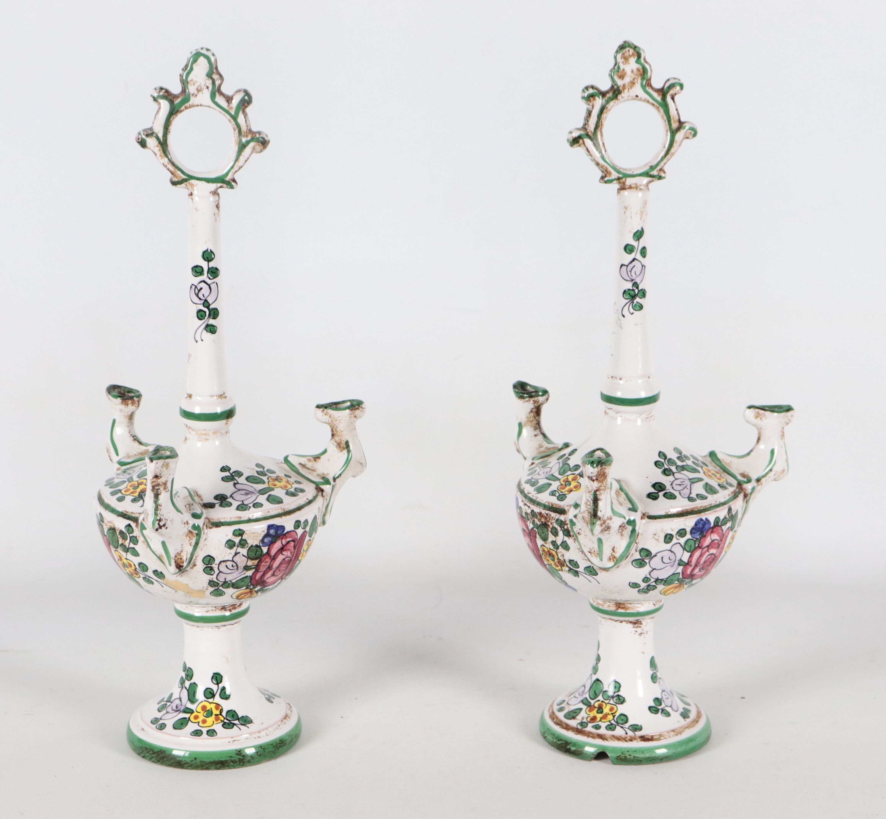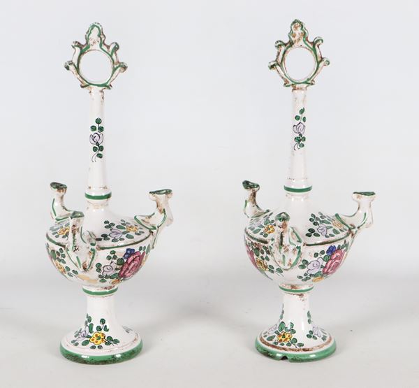 Coppia di lucerne da tavolo in maiolica Deruta, con decorazioni policrome a motivi di fiori e foglie