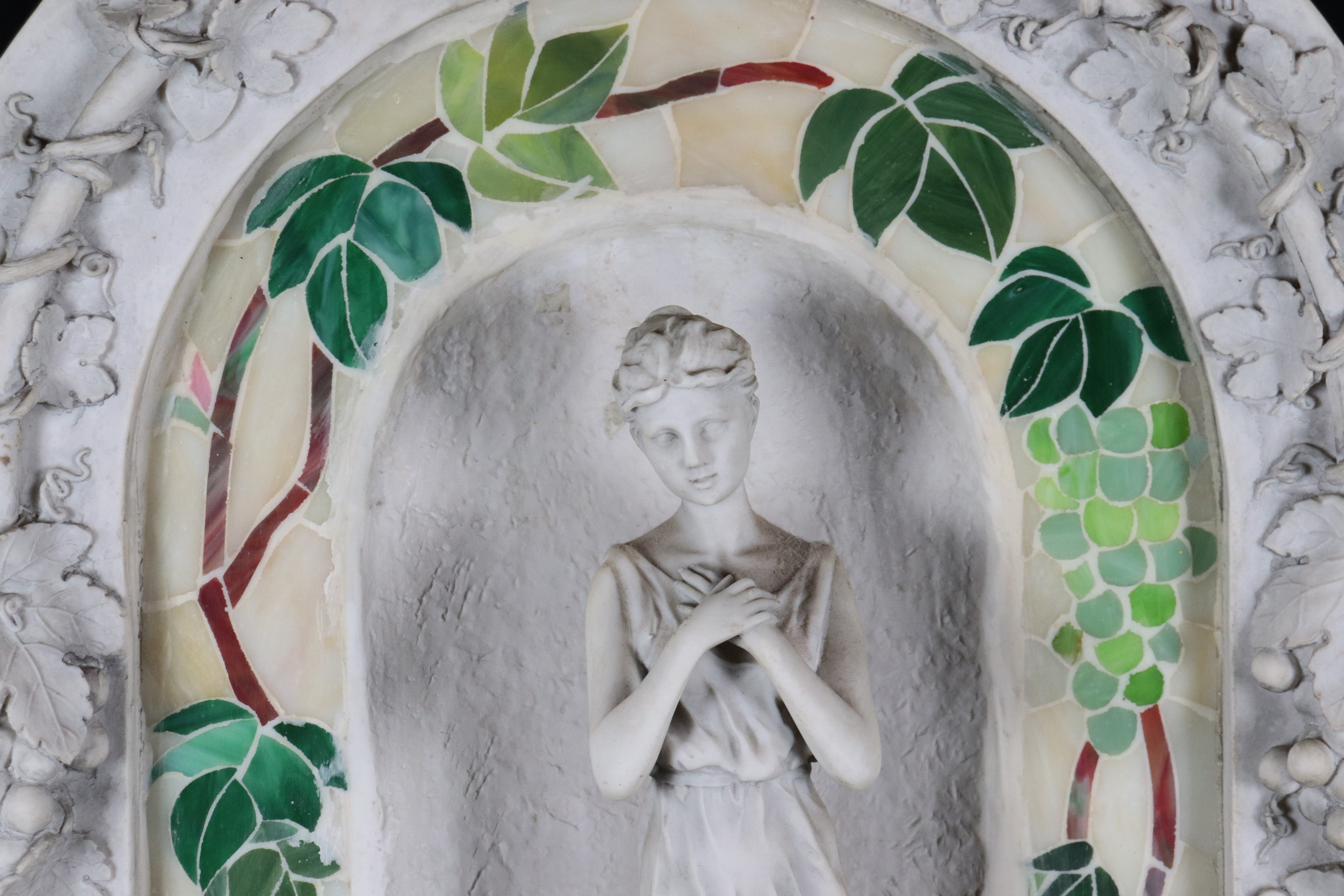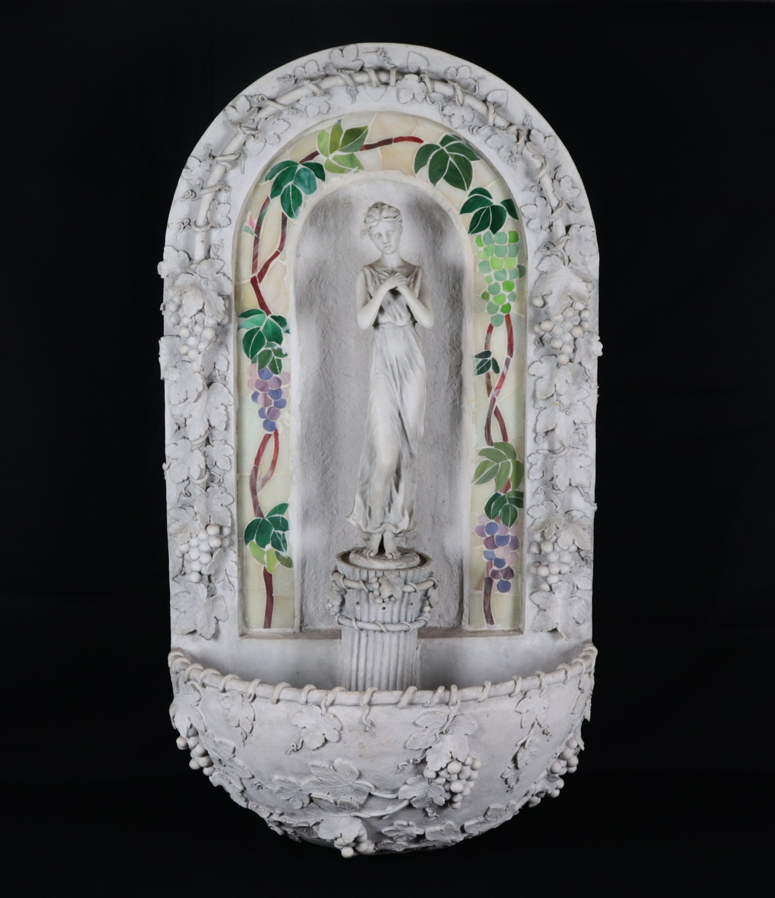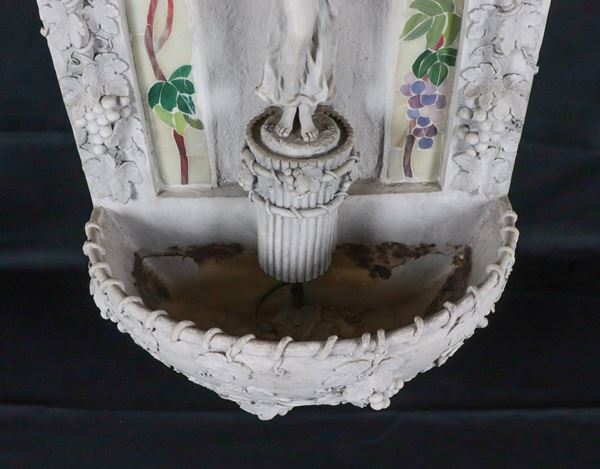Fontana da muro di gusto Liberty in cartapesta, resina e polvere di gesso, con scultura di vestale e grappoli d'uva a rilievo
