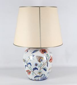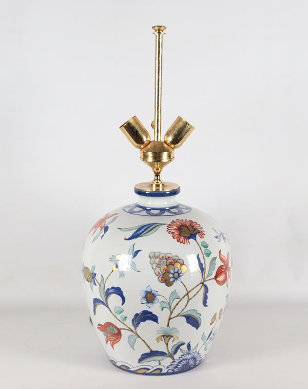 Lampada da tavolo in porcellana bianca, con decorazioni policrome a motivi floreali