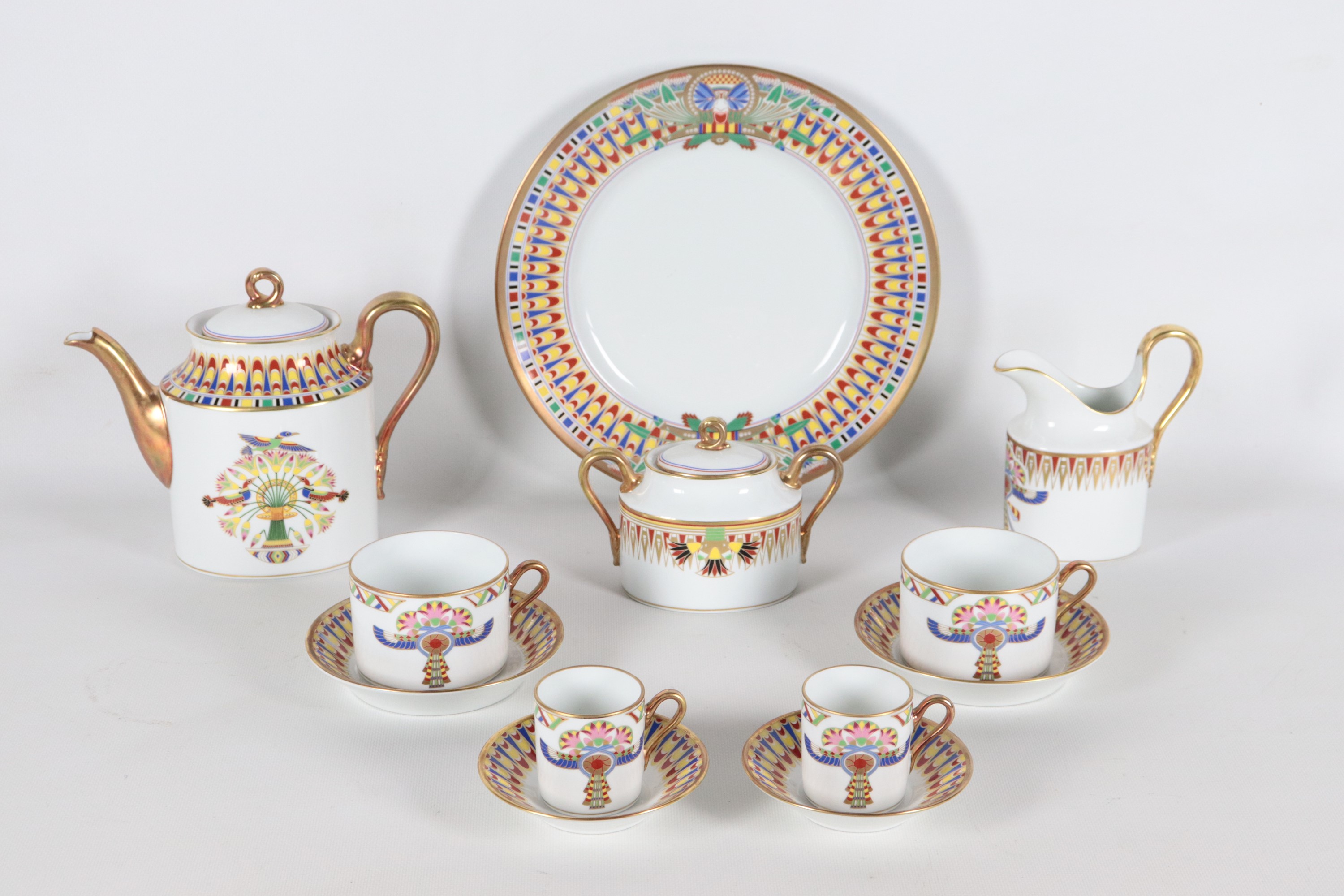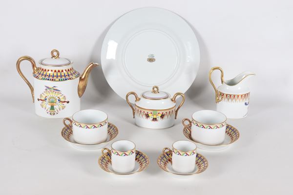 Tete a tete in porcellana Richard Ginori, con decorazioni policrome a motivi egizi e lumeggiature in oro zecchino (8 pz.)