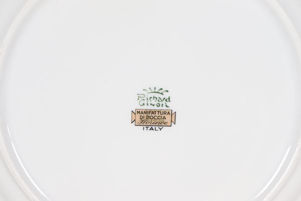 composto da: un piatto da dolce, caffettiera, lattiera, zuccheriera, due tazzine da caffè con piattini e due tazze grandi con piattini. Misura massima: diametro cm 26,5.