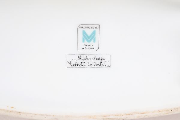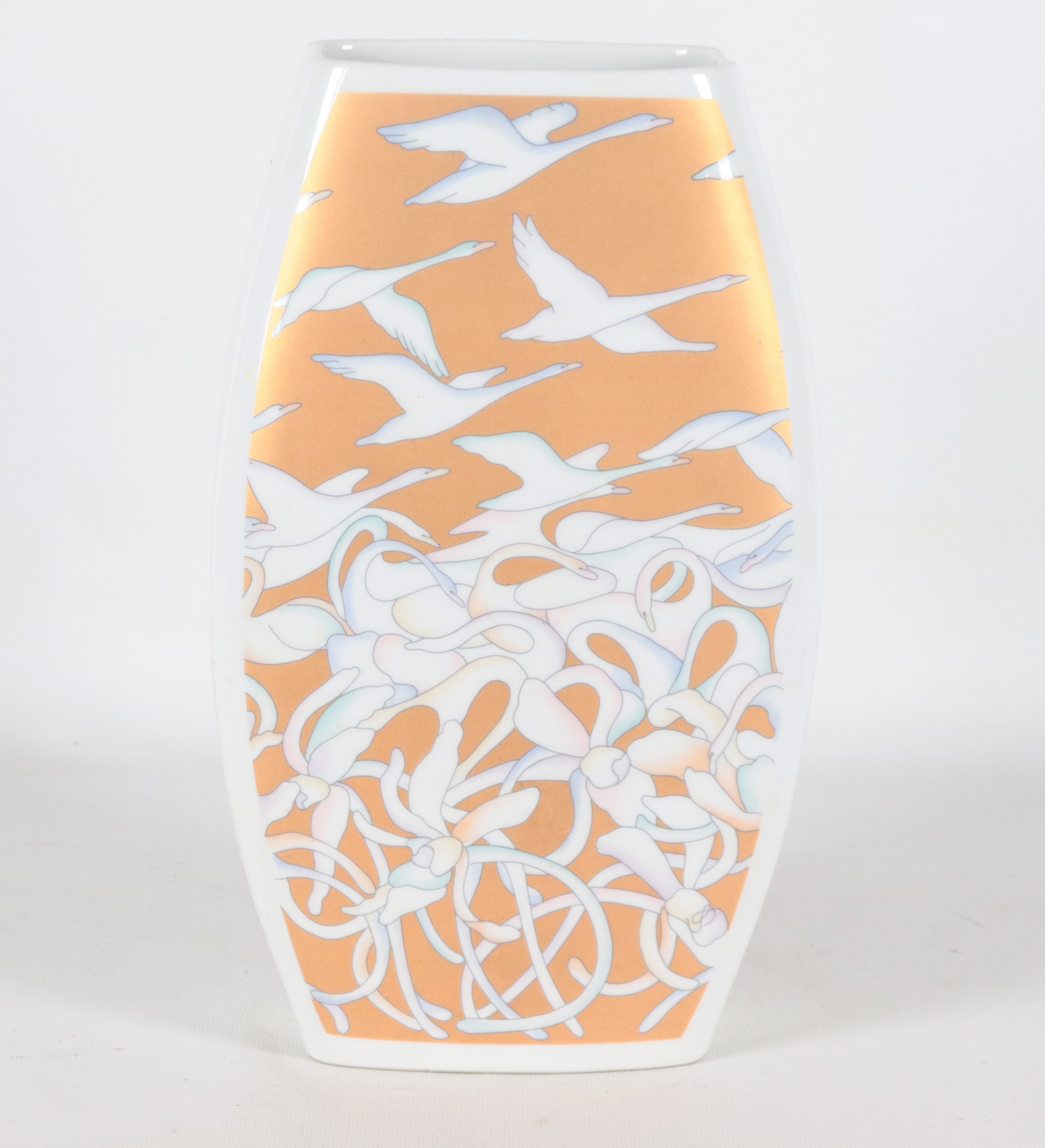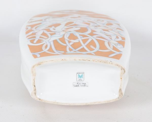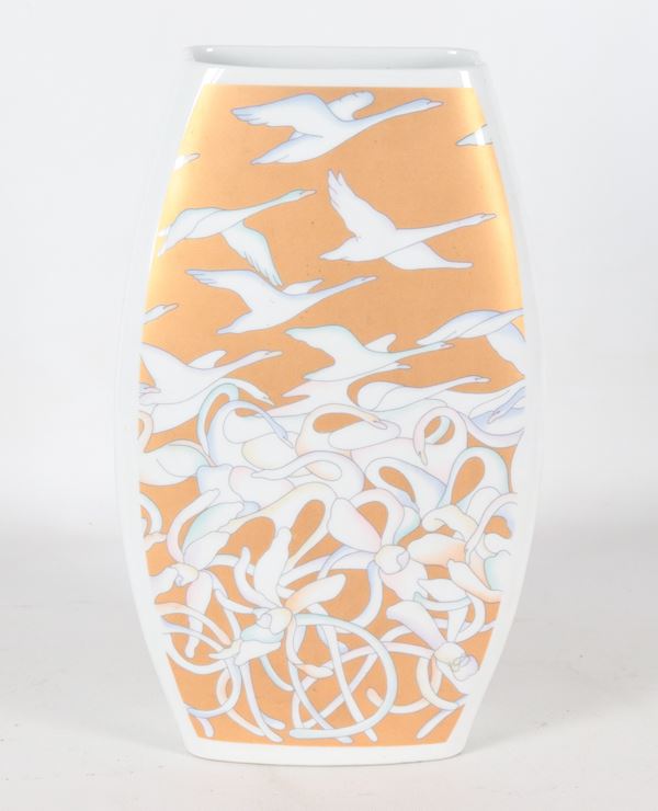 Vaso in porcellana smaltata con decorazioni in bianco a motivi di gabbiani e cicogne su fondo ocra. Marcato Michelotto, studio design Velati [..]